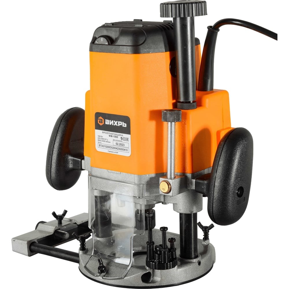Фрезерная машина Вихрь ФМ-1900 с увеличенной мощностью 1900 Вт предназначена для обработки древесины, древесно-стружечных материалов и пластмассовых изделий на необходимую глубину. Для ее функционирования требуется напряжение однофазной сети. Частота вращения фрезера от 8000 до 23000 об/мин обеспечивает высокую скорость работы. Возможна настройка числа оборотов в зависимости от выполняемой задачи. Шкала с размером цанги 6, 8, 12 мм позволяет регулировать глубину обработки. Для быстрой и безопасной замены режущего элемента предусмотрена функция блокировки шпинделя. Параллельный упор электрического фрезеровщика делает возможным точное движение вдоль края изделия на установленном расстоянии. Рабочий ход фрезы 50 мм обеспечивает высокую производительность работы. Система защиты от случайного запуска гарантирует безопасность эксплуатации. Фрезерная машина Вихрь ФМ-1900 оснащена прорезиненными ручками с двух сторон корпуса. В сочетании с весом инструмента 5,7 кг они обеспечивают надежность удержания и значительно снижают вибрацию в процессе работы. Нижняя часть из алюминия обеспечивает плавное скольжение и исключает появление царапин на поверхности изделия. Фрезер имеет пылеотводный патрубок для комфортной работы. Инструмент используется для обработки кромки, пазов, изготовления отверстий разнообразной формы.