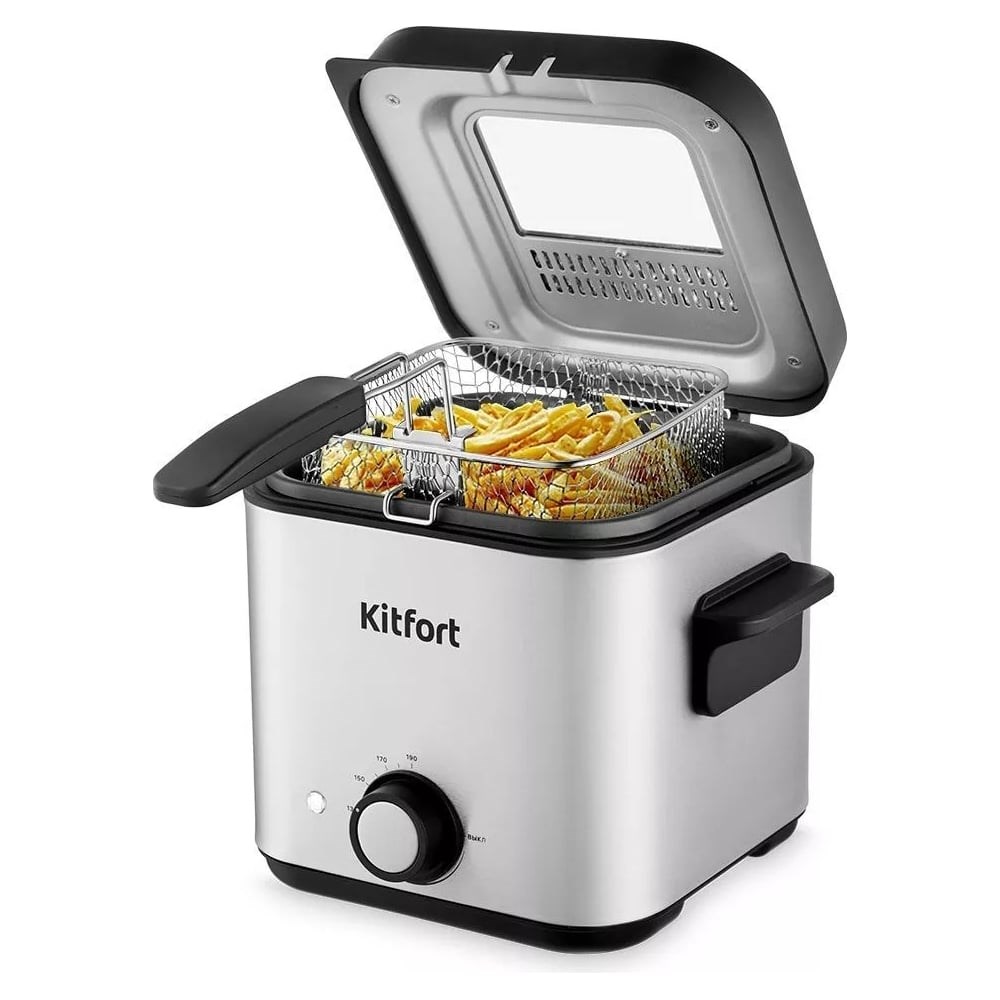 Фритюрница КТ-4075 предназначена для приготовления продуктов в слое горячего масла. С помощью прибора вы можете приготовить картофель фри, пончики, куриные крылышки в домашних условиях. Также можно жарить овощи, рыбу, мясо, морепродукты в кляре и без. На передней стороне прибора расположены регулятор температуры и индикатор нагрева. Ручкой регулятора выбирается температура от 130 до 190°C. Индикатор нагрева горит, когда происходит нагрев фритюрницы. Крышка прибора съёмная, что упрощает уход за фритюрницей. На крышке расположены отверстия для выхода пара с фильтром. Благодаря фильтру брызги масла не проходят через отверстия. В крышке фритюрницы имеется смотровое окно, через которое вы сможете легко следить за готовностью блюда, не поднимая крышку. Фритюрница отличается компактностью. Две ручки по бокам прибора позволяют легко переносить фритюрницу. Для удобства хранения корзина для жарки имеет съёмную ручку: в разобранном виде корзина и ручка помещаются внутрь фритюрницы. У фритюрницы есть защита от перегрева. Установленный в прибор термостат отключит нагрев прибора, если температура превысит допустимое значение. Небольшой объём чаши позволяет экономно расходовать масло. Фритюрница прекрасно подойдёт для каждодневного использования: вы без проблем приготовите 1-2 порции за раз.