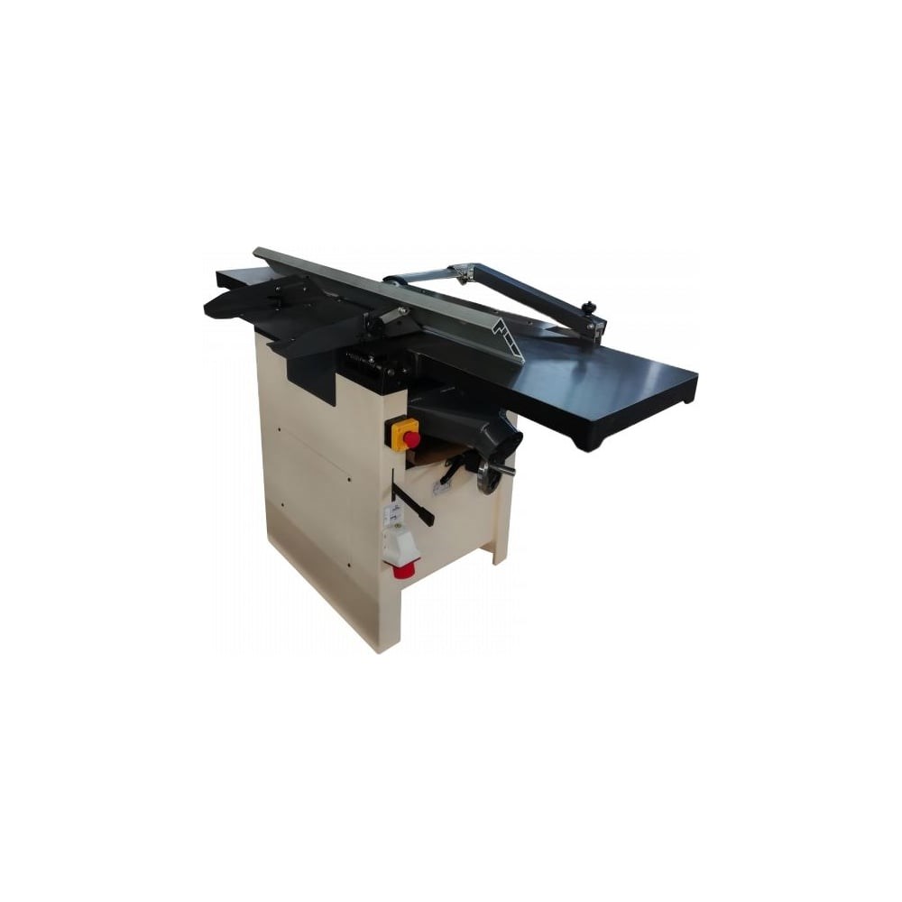 Фуговально-рейсмусовый станок предназначен для строгания и рейсмусования. Устройство объединяет все операции для калибровки доски. Станок сконструирован из цельнолитых чугунных деталей, что обеспечивает прочность, стабильность и отсутствие вибрации. Верхний модуль может быть полностью поднят, не мешая работе и удалению стружки. Станок оснащен эксцентриковым механизмом для удобной регулировки положения, подающего и отводящего столов. Спиральный вал, входящий в базовую комплектацию, оснащен режущими твердосплавными пластинами. Этот вал надежен и не требует регулировки. Благодаря непрерывному входу ножа в заготовку, вал работает тихо и без вибрации. Скорость вращения 5500 об/мин обеспечивает чистоту реза. Для строгания вдоль кромки или под углом от 90 до 45 градусов станок оснащен параллельными упорами из жестких алюминиевых профилей.