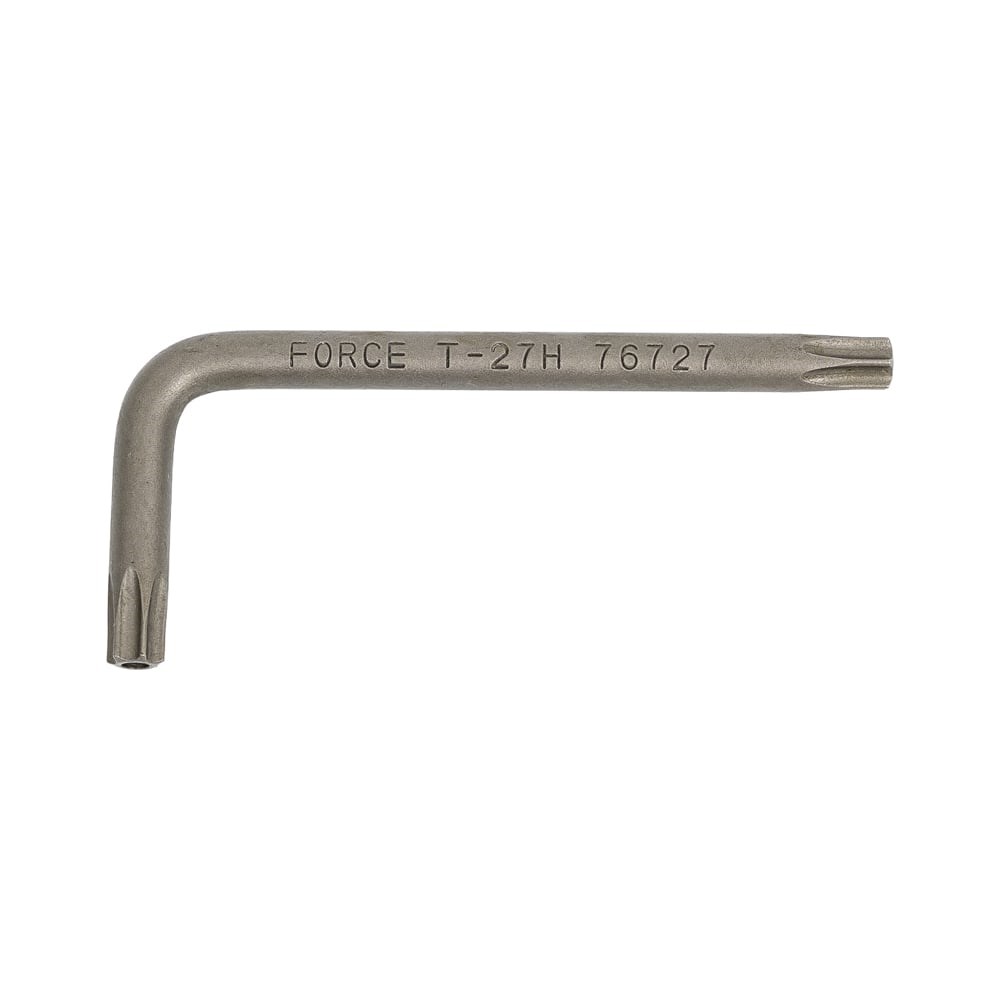 Г-образный ключ с отверстием FORCE Т-27Н 76727 представляет собой изделие для снятия и установки винтов с внутренним антивандальным Torx. Изделие выглядит как Г-образный стержень с отверстием. Ключ выполнен из прочной стали, которая обладает стойкостью к нагрузкам.