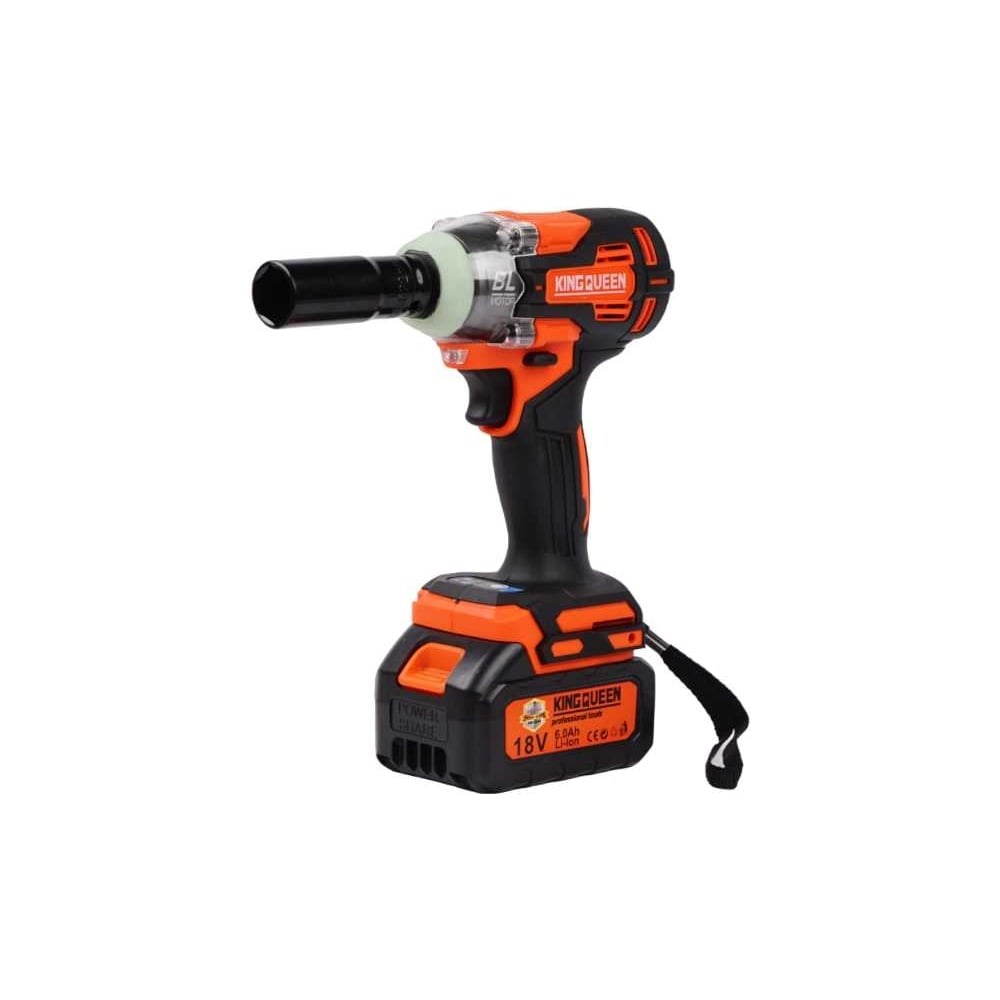 Аккумуляторный гайковерт «KINGQUEEN» нужен для оперативного закручивания или откручивания гаек или болтов. Инструмент оснащен мощным бесщеточным двигателем с крутящим моментом 320 Нм, который разгоняет скорость вращения шпинделя до 2600 оборотов в минуту. Он оснащен кнопкой реверса для смены направления вращения, имеет 3 скорости переключаемые кнопкой, также плавную регулировку оборотов пусковой кнопкой и оснащен электрическим тормозом. Легкая и удобная конструкция гайковерта позволяет работать в любом месте. Благодаря встроенной подсветке из светодиодов, можно работать даже при плохом освещении. Рукоятка снабжена мягкими прорезиненными вставками для надежного и комфортного хвата инструмента. Так же не перегревается при длительной работе.