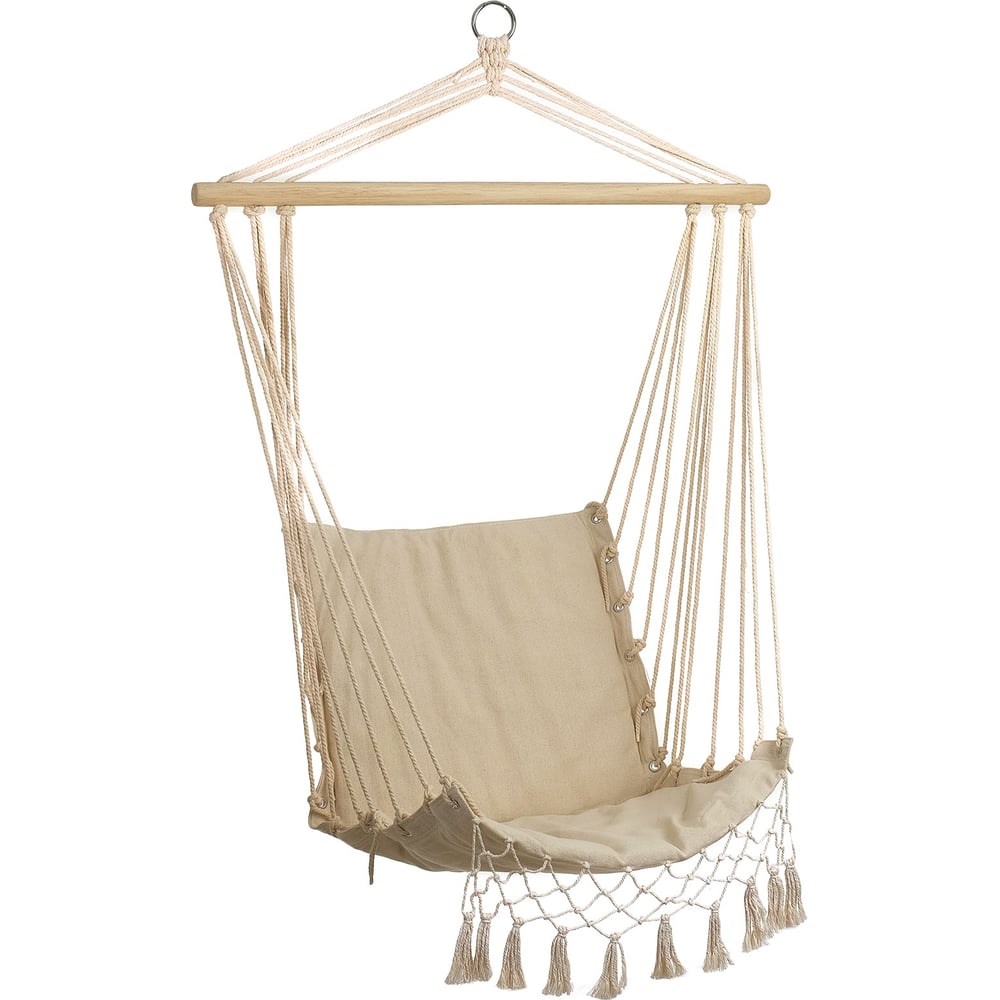 Гамак Maclay 96x50 см, хлопок, цвет бежевый 3941089 используется для отдыха на природе. Деревянная планка создает удобную форму, в которой комфортно расположиться. Железное кольцо позволяет надежно зафиксировать гамак.