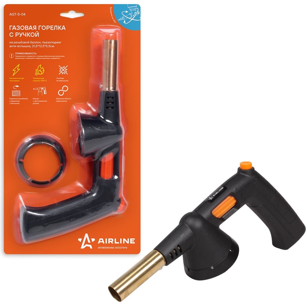 Газовая горелка Airline с ручкой на резьбовой баллон, пьезоподжиг, анти-вспышка, 21,5x12,5x5,5 см AGT-S-04 представляет собой насадку с соплом на газовый баллон с резьбовым типом крепления. Горелка имеет эргономичную ручку для удобного использования. Применяется для розжига костра, разогрева трубопровода, нагрева предметов и проведения различных ремонтных работ. Горелка-насадка используется совместно со стандартным газовым баллоном резьбового типа, который в комплект поставки не входит. Дополнительные характеристики: Автоматический пьезоподжиг Надежное соединение с баллоном Температура пламени 1300?С Система антивспышки Корпус с эргономичной ручкой Широкая область применения