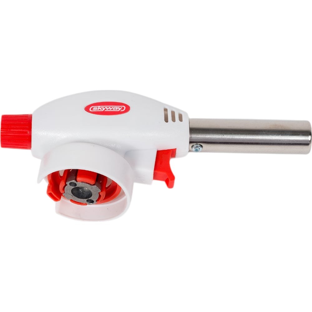 Горелка газовая SKYWAY на цанговый баллон с пьезоподжигом 1001 - предназначена для быстрого разжигания огня (уголь, дрова, щепа, трава), особенно в сырую погоду. Разогретая горелка дает ровный факел и стабильно работает при наклонах не более 40 градусов. Простая установка на газовый баллон.Область применения:Плавление и сварка изделий из стекла и пластмасс, включая пластиковые трубы.Для пайки и сварки легкоплавких металлов, а также среднеплавких и различных сплавов.Для разогрева различных предметов и поверхностей, в том числе примерзших.Для удаления старой краски, обжига дерева, кирпича, обработки шкур и т.д.Характеристики:Тип: горелка газоваяПрименяемость: на цанговый баллонАнтивспышка: даПьезоподжиг: автоматическийРегулятор пламени: даРазмер: 170*40*70 ммТемпература пламени: до 1300 ºСДиаметр сопла: 19 ммСостав: сплав цинка, АВС-пластик.Расход газа: 80-125 гр/чВремя работы на 1 баллоне: 100-120 минЦвет: белый/красный