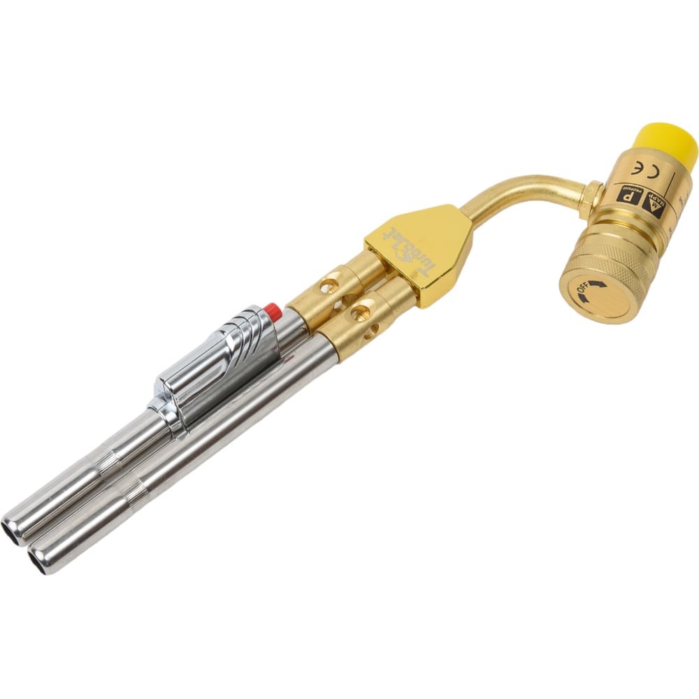 Самая мощная профессиональная газовая горелка на МАПП-газе из всего ассортимента с тепловой мощностью 6,5 кВт.Имеет 2 сопла с углом вращения 360°.Способна подавать очень высокую температуру в труднодоступные места и производить пайку медных труб с диаметром до 50 мм.Плавный регулятор подачи пламени обеспечивает стабильную подачу газа.Основным назначением данной модели является пайка при монтаже и ремонте климатического и холодильного оборудования, пайка металлов твердым припоем. Может применяться для обжига деревянных конструкций, отжига приржавевших болтов и гаек.