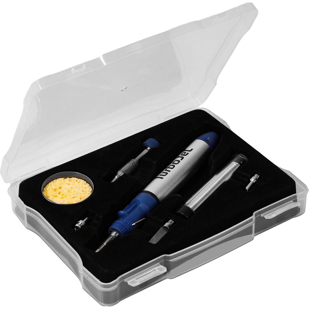 В набор для пайки TJ250-B входят: газовый паяльник на пропан- бутане, дополнительные насадки, припой в катушке, губка для чистки наконечника паяльника. Газовый паяльник TJ200-B работает в 3-х режимах: паяльник для пайки электроприборов, горячий фен для термоусадки горелка с игольчатым (карандашным) пламенем для местного нагрева. Применяется для точных работ по металлу, пластику и дереву, для ремонта и изготовления ювелирных изделий, пайки электроники.