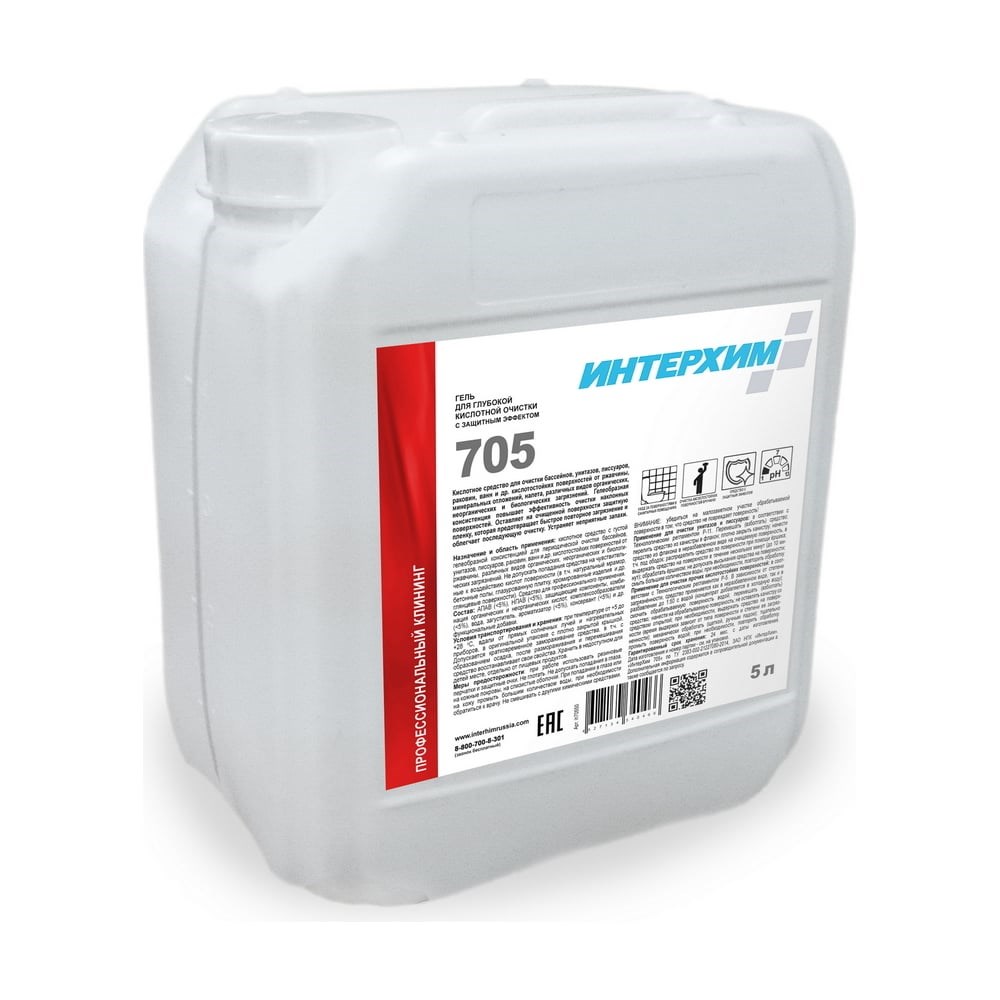 Гель для глубокой кислотной очистки ИНТЕРХИМ 705 с защитным эффектом, 5 л ih70550 - кислотное средство с гелеобразной консистенцией для периодической очистки бассейнов, унитазов, писсуаров, раковин, ванн и др. кислотостойких поверхностей от ржавчины, налета, минеральных отложений, различных видов органических, неорганических и биологических загрязнений.Формирует на очищенной поверхности защитную пленку, которая предотвращает быстрое повторное загрязнение и облегчает последующую очистку.Устраняет неприятные запахи.Не допускать попадания средства на чувствительные к воздействию кислот поверхности (в т.ч. натуральный мрамор, бетонные полы, глазурованную плитку, хромированные изделия и др. глянцевые поверхности).Средство для профессионального применения.