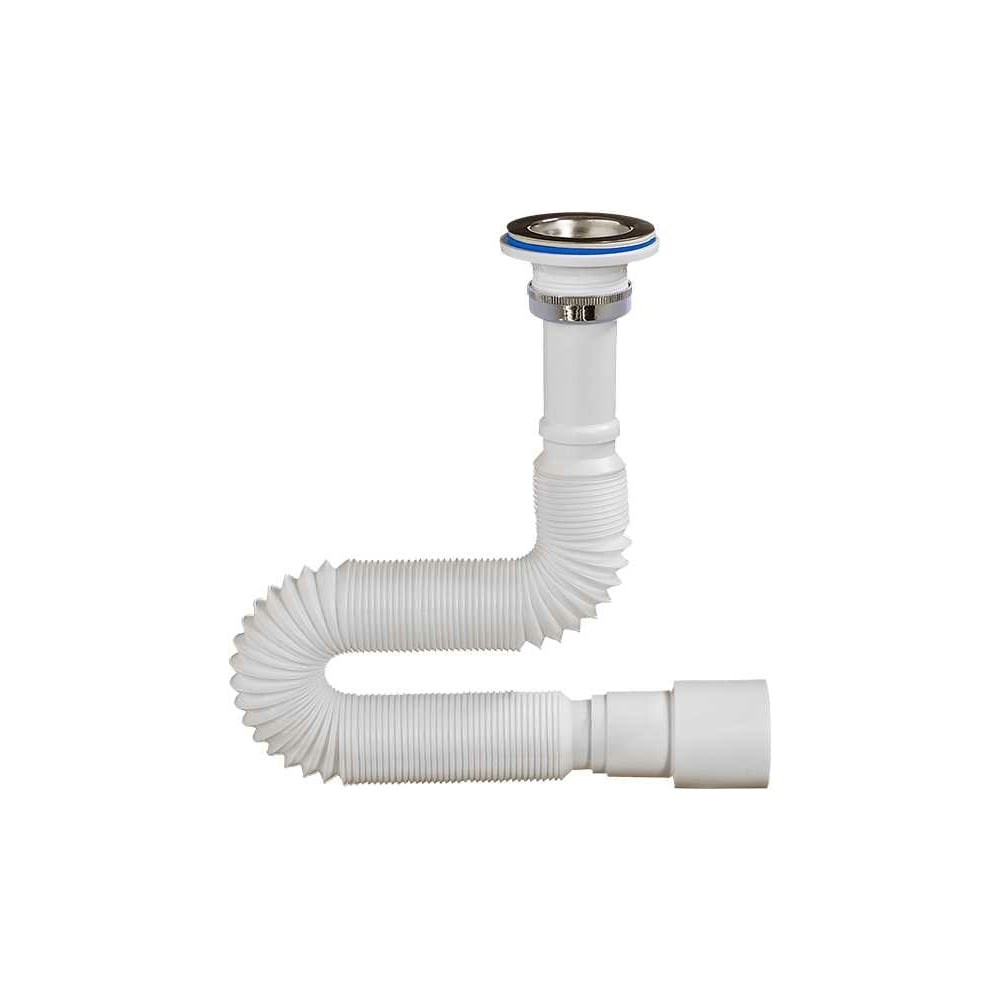 Гибкая труба 1 1/4"х40/50, с выпуском с нержавеющей чашкой д.63мм, латунной гайкой д.32мм и выходом в канализацию 40/50мм, для умывальника. Длина гибкой трубы 470-1250мм. В комплекте идёт латунная хромированная гайка д. 32мм и полированная нержавеющая чашка д.63мм. Сифон комплектуется нержавеющим винтом длиной 75мм и нержавеющей гайкой М6. Гибкую трубу можно подключить в слив канализации с диаметрами 40 или 50мм.