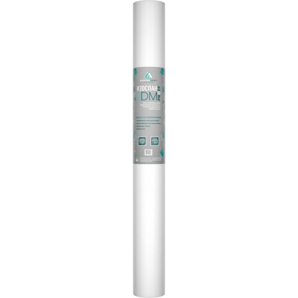 Паро-гидроизоляция повышенной прочности с антиконденсатной поверхностью Изоспан DM, 70 кв. м 11.02.03.14.01.101.0000.1600.00 - материал на основе высокопрочного тканого полипропиленового полотна с антиконденсатной поверхностью. Материал Изоспан DM паронепроницаем, обладает повышенной прочностью и высокой водоупорностью, что позволяет применять его в качестве: пароизоляции в конструкциях утепленных скатных кровель, каркасных стен и перекрытий для защиты утеплителя и внутренних элементов конструкций от проникновения паров воды изнутри помещения, а также для предотвращения проникновения частиц волокнистого утеплителя во внутреннее пространство здания; подкровельной гидроизоляции в конструкциях неутепленных скатных кровель для защиты элементов конструкции от подкровельного конденсата и атмосферных осадков, проникающих под кровлю; временного покрытия для гидроизоляции стен и кровель, но не более 3–4 месяцев. Высокая за счет тканой структуры прочность материала позволяет применять его в условиях повышенных нагрузок при монтаже (погодные условия, сложность конструкции, продолжительность монтажа) и эксплуатации. Антиконденсатная поверхность материала Изоспан DM снижает риск падения капель конденсата с поверхности материала на внутреннюю отделку, а в случае неутепленной кровли — на перекрытие чердака. При соблюдении всех требований к монтажу применение паро-гидроизоляции Изоспан DM позволяет сохранить теплоизоляционные свойства утеплителя и продлить срок службы конструкций.