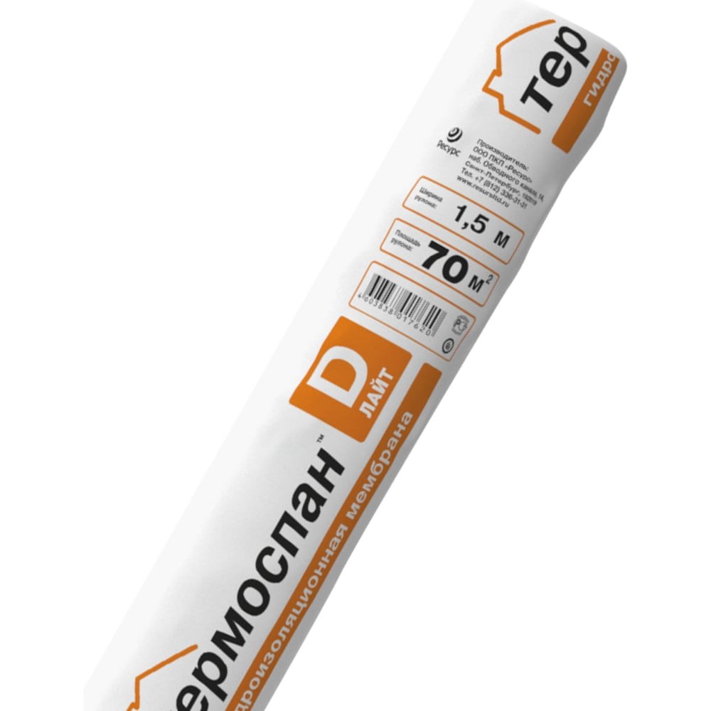 Гидроизоляция Ресурс Термоспан D Лайт 70 кв.м. 1,5 м 22489 - мембрана повышенной прочности на основе полипропиленовой ткани, ламинированная гидроизоляционной пленкой. Служит защитой утеплителя с внутренней стороны от проникновения водяных паров, конденсата. Выдерживает значительные механические нагрузки, вт.ч. и снеговые. Применяется в качестве гидроизоляции при устройстве полов, вне утепленных и плоских кровлях. Подходит в качестве временной кровли на период не более 3-4 месяцев.