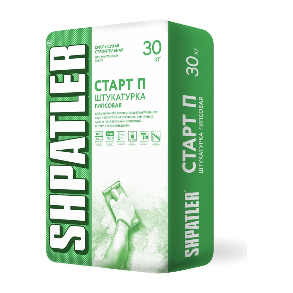 Гипсовая штукатурка ШПАТЛЕР Старт Плюс 30 кг Ш00045 - сухая смесь на гипсовой основе с добавлением легкого наполнителя, модифицированная минеральными и полимерными добавками. При смешивании с водой образует пластичную растворную смесь, удобную для нанесения и последующего заглаживания. Рекомендуется как для машинного, так и для ручного нанесения. Сухая смесь предназначена для ручного и механизированного оштукатуривания стен и потолков из бетонных, кирпичных, газо- и пенобетонных оснований. Оштукатуренная поверхность доводится до глянца без последующего шпатлевания. Приготовление растворной смеси: При ручном нанесении добавьте сухую смесь в ёмкость с заранее отмеренным количеством воды (на 30 кг (мешок) сухой смеси требуется 10,2-11,1 л) и перемешайте с помощью электромиксера или низкооборотной электродрели со специальной насадкой до получения однородной консистенции. Дайте растворной смеси постоять 5 минут и перемешайте её повторно. Растворная смесь готова к применению. Время использования готовой растворной смеси не менее 1,5 ч. В процессе работы рекомендуется периодически перемешивать растворную смесь. При машинном нанесении расход воды подбирается опытным путем.