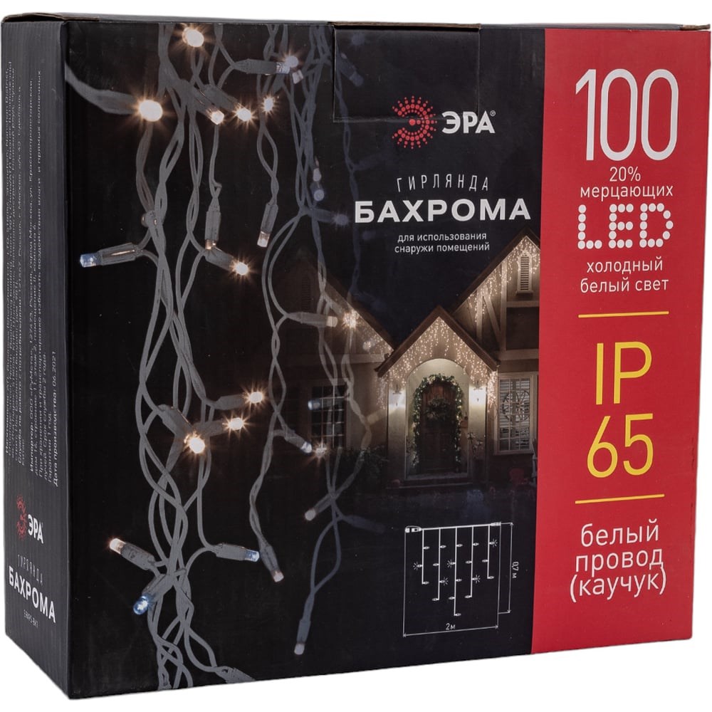 Гирлянда ЭРА Бахрома 100LED, 2х0.7м, холодный свет, белый, мерцание, каучук, 220В, IP65 Б0051890 с высокой защитой от влаги и пыли IP65. Волшебное свечение холодного белого цвета создают 100 ярких светодиодов последнего поколения, 20% LED-диодов имеют эффектноемерцание. Гирлянда новогодняя входит в коллекцию профессионального зимнегоосвещения ЭРА для проектного декорирования. С помощью данной электрогирлянды и необходимых для ее подключения электрических аксессуаров (провод с вилкой, разветвители, удлинители, заглушки, которые приобретаются отдельно в формате конструктора) и профессиональный декоратор, и любитель сможет создать масштабные световые инсталляции для празднования Нового года и Рождества. Монтаж профессиональной уличной иллюминации ЭРА, соединение в единую линию и демонтаж абсолютно безопасны. Системы профессионального новогоднего освещения ЭРА для улиц устойчивы к самым низким температурам, обилию снега, наледи, порывам ветра. Гирлянда идеальна для украшения загородных домов, коттеджей, муниципальных объектов, фасадов зданий, бизнес-центров, ресторанов, парков, скверов, улиц. Размер гирлянды уличной новогодней -2м х 0,7м. Изготовлена из прочного мягкого каучука белого цвета. Гирлянды с белыми проводами находятся на пике популярности.