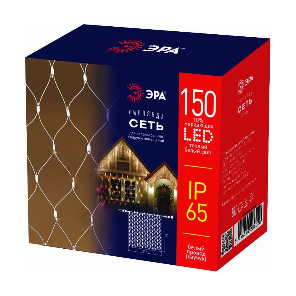 Гирлянда ЭРА Сеть 150LED, 1.5х2 м, теплый белый свет, каучук, 220В, IP65 Б0051894 с теплым белым светом и эффектом мерцания. В составе гирлянды новогодней для улицы 150 ярчайших светодиодов последнего поколения, 20% из которых мерцающие - такое свечение создает волшебную и очень уютную праздничную атмосферу на улицах города или во дворе загородного дома. Провода гирлянды уличной изготовлены из белого каучука - популярное и удачное решение для зимы. Мягкий прочный каучук высокого класса морозостоек, сохраняет свои свойства даже при очень низких температурах, не боится осадков. Новогодняя профессиональная гирлянда ЭРА позволяет реализовать масштабные световые системы для праздничного украшения улиц, парков, площадей, уличных новогодних ярмарок, фасадов зданий. Профессиональное новогоднее освещение ЭРА выпускается в формате конструктора - можно заказать нужные вам гирлянды, коннекторы, разветвители и другие электрические аксессуары для подключения иллюминации в зависимости от конкретных задач проекта.