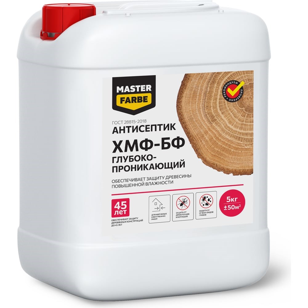Глубокопроникающий антисептик для защиты древесины повышенной влажности MASTERFARBE ХМФ-БФ 5 кг 4631159427316 предназначен для защиты деревянных строительных конструкций от биологического разрушения (грибов гниения, синевы, плесени, поражения насекомыми древоточцами) при контакте с грунтом, атмосферными осадками внутри и снаружи помещений.Может использоваться как антисептический грунт перед окрашиванием укрывающими лакокрасочными материалами.Преимущества:Обеспечивает защиту деревянных конструкций до 45 летХимически связывается с древесинойНе создает поверхностной пленки и не нарушает воздухообменСохраняет свойства и структуру древесиныНе имеет запаха.Является малоопасным веществом (IV класс опасности), не горюч и взрывобезопасенПосле высыхания антисептик безопасен для людей и животных