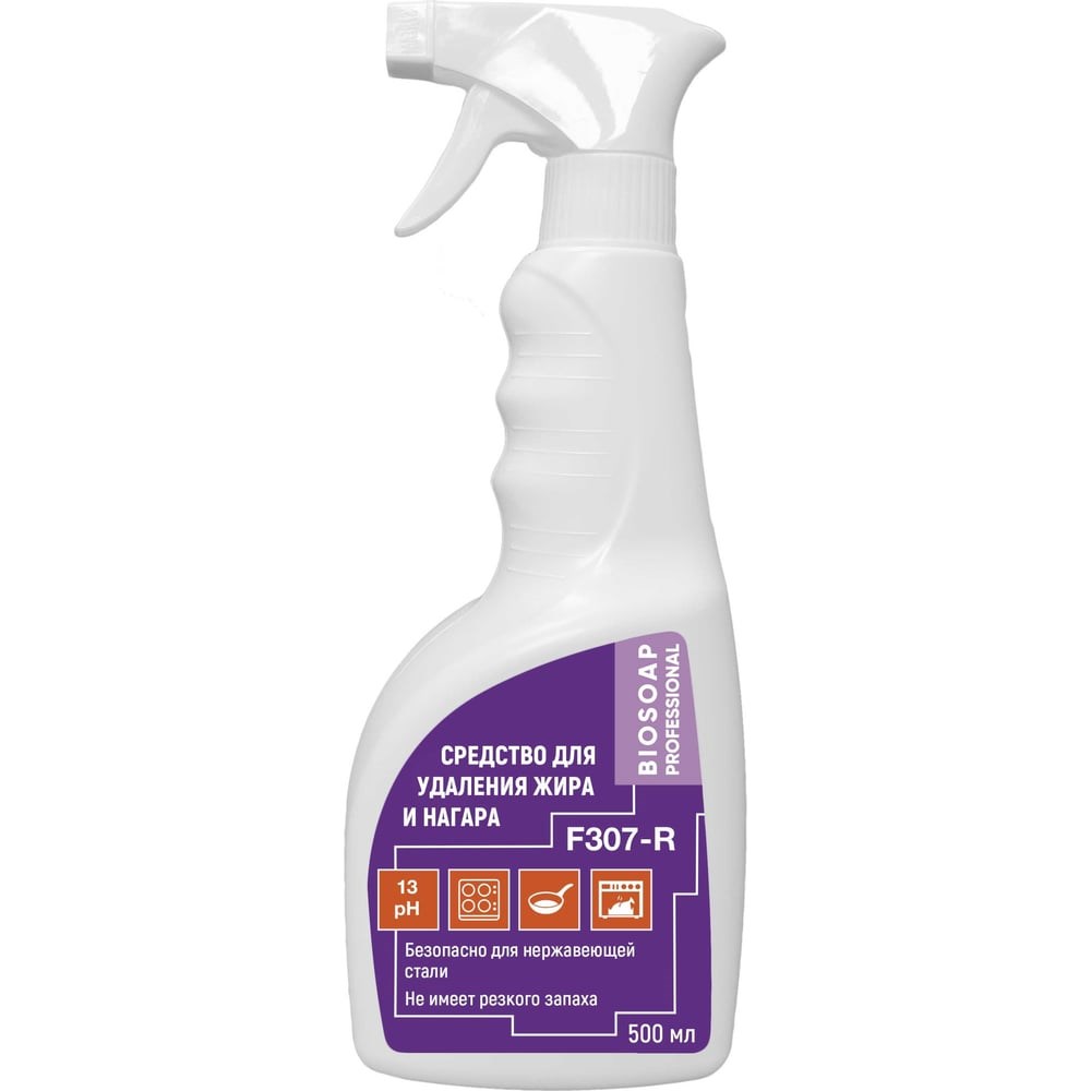 Средство для удаления жира и нагара АиС BIOSOAP Proffecional / F307-R 500мл 9050355 для очистки варочных поверхностей, пароконвектоматов, коптилен, грилей, печей, хосперов, жироуловителей, оборудования для термообработки в пищевой промышленности и быту. Эффективно удаляет пригоревшие белковые и жиромасляные загрязнения, нагар и сажу. Применение: Для очистки наружной поверхности от пригоревшего жира и нагара: При возможности разогреть поверхность до температуры - 70-80 °C. Нанести средство на поверхность в виде пены или эмульсии. Время контакта с поверхностью: ГОРЯЧАЯ - менее 1 мин., ХОЛОДНАЯ - 3-5 мин. Промыть оборудование большим количеством теплой или горячей воды (при невозможности использования большого количества воды: протереть бумажными полотенцами, затем влажной прорезиненной пористой салфеткой или губкой). Для очистки пароконвектомата: Равномерно нанести средство на внутреннюю поверхность. Установить режим 'самоочистка' или 'пар', на 30-40мин. Хорошо промыть поверхность проточной водой.
