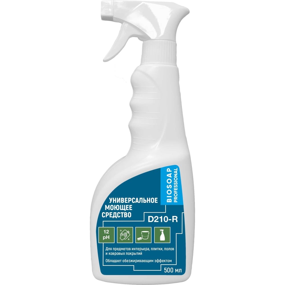 Готовое универсальное моющее АиС BIOSOAP Proffecional / D210-R 500мл 9020255 подходит для ежедневной и генеральной уборки различных покрытий. Можно использовать для мытья плитки и кафеля, линолеума, стекол и зеркал, пластика, сантехники и прочих моющихся поверхностей. Легко удаляет белковые и масляные загрязнения, легкие известковые отложения, а также пятна с тканевых и ковровых покрытий.Применение:Нанести на очищаемую поверхность при помощи распылителя или мягкой губки.Оставить на 1-2 мин. для ежедневной уборки, на 3-7 мин. для въевшихся загрязнений .Почистить поверхность мягкой щеткой, если это допустимо.Промыть поверхность чистой водой или протереть влажной салфеткой.