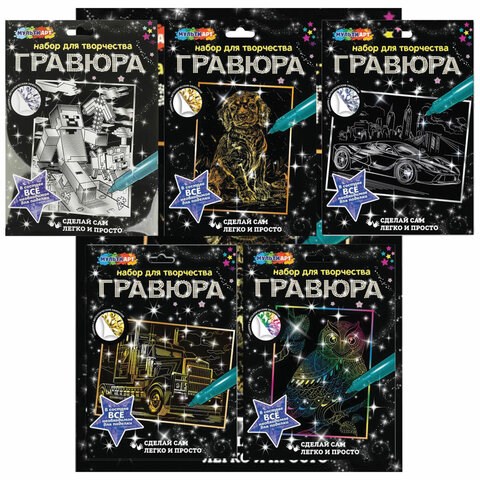 Контур рисунка уже нанесен на черный фон. С помощью специального штихеля изображение процарапывается, из-под слоя краски появляется основа (золотая, серебряная, голографическая). В результате получается контрастный рисунок. Набор содержит все необходимое для создания оригинальной картины: основу с контуром, штихель, инструкцию.