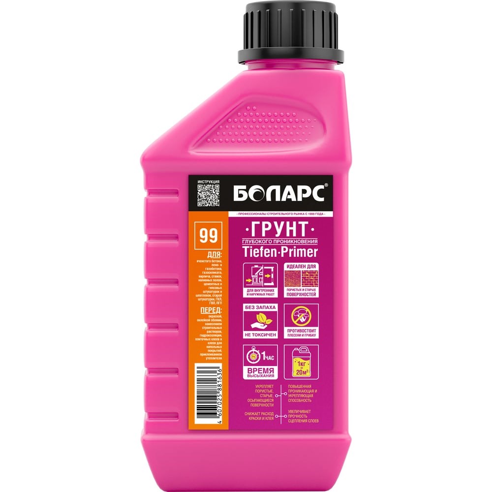 Грунт БОЛАРС Tiefen Primer 99 глубокого проникновения, 1 кг 00000042432 предназначен для укрепления пористых, рыхлых, старых, осыпающихся, сильно впитывающих влагу оснований перед последующим нанесением строительных растворов и отделочных материалов, перед окраской и оклейкой обоями, перед нанесением гидроизоляции, плиточных клеев и клеев для напольных покрытий, приклеиванием плит утеплителя. Благодаря составу, продукт глубоко проникает в основание и запечатывает поры. Снижает впитывающую способность основания, связывает пыль, увеличивает сцепление материалов с основанием, обеспечивает долговечность отделки. Экономит расход отделочных материалов, обеспечивая их равномерное нанесение. Рекомендован для помещений с повышенной влажностью (кухни, ванные комнаты). Бесцветный после высыхания. Не влияет на паропроницаемость поверхности. Разрешен для применения в детских и медицинских учреждениях. Применяется по основаниям: ячеистый бетон, пенно- и газобетон, газосиликат, кирпич, стяжки и наливные полы, цементные и гипсовые штукатурки и шпатлевки, старая штукатурка, ГКЛ, ГВЛ, ПГП.