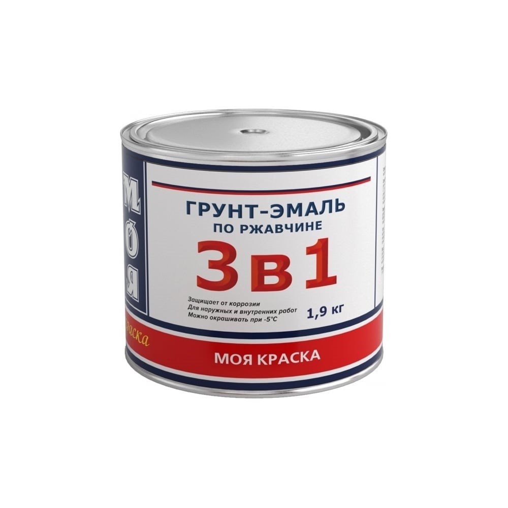 Грунт-Эмаль МОЯ КРАСКА 3 в 1, черная, 1.9 кг 16440 - это антикоррозийное средство для наружных и внутренних работ. Данное средство от ржавчины на металле предназначено для защиты и окраски металлических поверхностей без наличия ржавчины или подвергнутых коррозии со слоем ржавчины до 0,1мм. Краска 3 в 1 по металлу является и нейтрализатором ржавчины, и антикоррозийным грунтом, и декоративной эмалью. Краска по ржавчине применяется для окраски чистых и прокорродировавших металлических поверхностей, а так же дерева, бетона, пластика. Краска по металлу от ржавчины образует прочное полуматовое антикоррозийное покрытие, которое сохраняет свои свойства в течение 2-3 лет. Средство от ржавчины на металле быстро сохнет - перестаёт липнуть уже через 6 часов, а полностью высыхает за 24 часа. Грунт эмаль 3 в 1 можно наносить методом "мокрый по-мокрому" с межслойной сушкой в 10-15 минут.