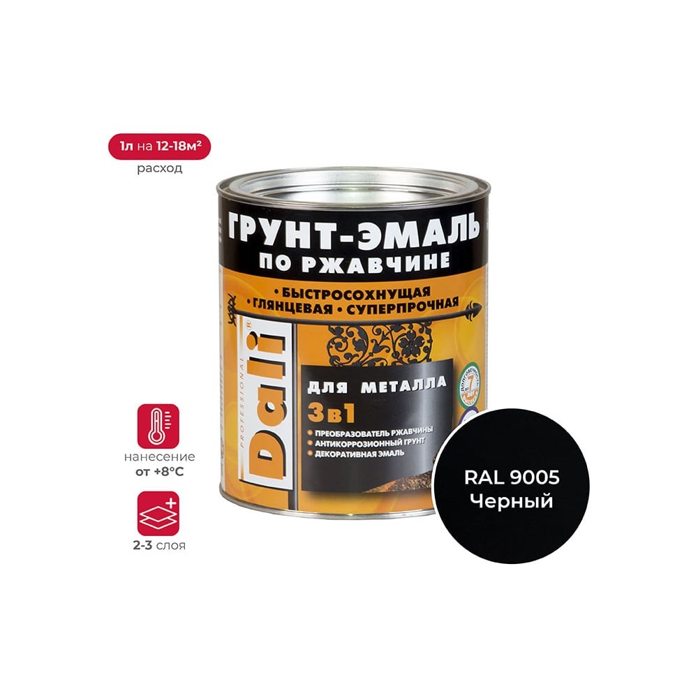 Предназначена для защитно-декоративной обработки различных металлических поверхностей. Применяется внутри и снаружи помещений по ЛЮБЫМ металлическим поверхностям, новым и ранее окрашенным.Допускается нанесение на деревянные поверхности влажностью не выше 20%, эксплуатируемые внутри помещений. Условия проведения работ: t° окружающего воздуха и поверхности от +8° до +30°С, относительная влажность воздуха не более 80%. Подготовка поверхности: ранее окрашенные поверхности рекомендуется предварительно проверить на совместимость: нанести грунт-эмаль на небольшой участок и выждать 60±5 мин. В случае отсутствия дефектов, поверхность очистить только от отслаивающихся слоев предыдущего покрытия. В противном случае полностью удалить старое покрытие. Не наносить на покрытия на основе НЦ и ХВ. В случае наличия ржавчины, очистить поверхность от рыхлого слоя металлической щеткой, протереть от пыли, грязи, обезжирить поверхность растворителем 646, бензином, уайт-спиритом, сольвентом или ацетоном и насухо протереть чистой тканью. Наносить в 2-3 слоя. Разбавление: допускается, но не более 10% от общей массы. Разбавитель: сольвент, ксилол, Р646/647. Расход: в 1 слой 1л на 12-18м². Высыхание: на отлип до 3 ч., межслойная сушка от 5 мин. до 3 ч., окончательный набор прочности до 7 суток. Степень глянца: глянцевый (не менее 75%). Очистка инструмента: уайт-спирит, сольвент, ксилол, Р 646/647. Хранение и транспортировка: при t° от -40° до +40°С не теряет свойств при замораживании. RAL 9005 Чёрный