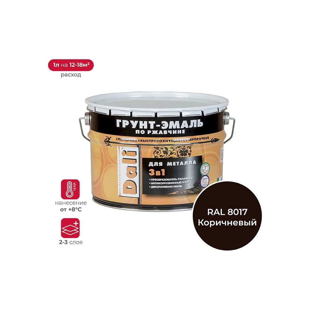 Предназначена для защитно-декоративной обработки различных металлических поверхностей. Применяется внутри и снаружи помещений по ЛЮБЫМ металлическим поверхностям, новым и ранее окрашенным.Допускается нанесение на деревянные поверхности влажностью не выше 20%, эксплуатируемые внутри помещений. Условия проведения работ: t° окружающего воздуха и поверхности от +8° до +30°С, относительная влажность воздуха не более 80%. Подготовка поверхности: ранее окрашенные поверхности рекомендуется предварительно проверить на совместимость: нанести грунт-эмаль на небольшой участок и выждать 60±5 мин. В случае отсутствия дефектов, поверхность очистить только от отслаивающихся слоев предыдущего покрытия. В противном случае полностью удалить старое покрытие. Не наносить на покрытия на основе НЦ и ХВ. В случае наличия ржавчины, очистить поверхность от рыхлого слоя металлической щеткой, протереть от пыли, грязи, обезжирить поверхность растворителем 646, бензином, уайт-спиритом, сольвентом или ацетоном и насухо протереть чистой тканью. Наносить в 2-3 слоя. Разбавление: допускается, но не более 10% от общей массы. Разбавитель: сольвент, ксилол, Р646/647. Расход: в 1 слой 1л на 12-18м². Высыхание: на отлип до 3 ч., межслойная сушка от 5 мин. до 3 ч., окончательный набор прочности до 7 суток. Степень глянца: глянцевый (не менее 75%). Очистка инструмента: уайт-спирит, сольвент, ксилол, Р 646/647. Хранение и транспортировка: при t° от -40° до +40°С не теряет свойств при замораживании. 8017 Коричневый