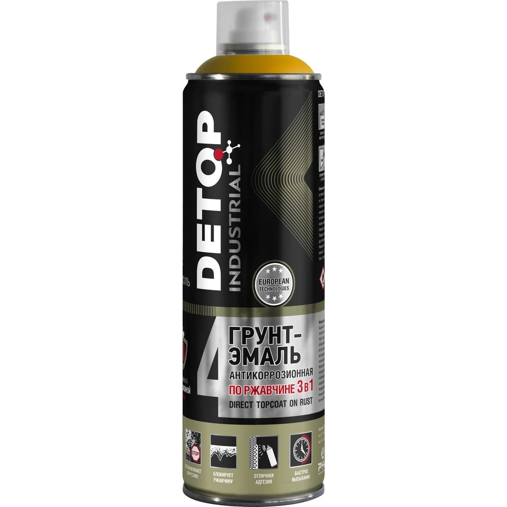 Грунт-эмаль DETOP по ржавчине 3 в 1, желтый, RAL 1005, аэрозоль 650 мл DTI-A07712 выполняет функцию преобразователя ржавчины, антикоррозионного грунта и декоративной эмали. Применяется для покраски чугунных и стальных поверхностей с различной степенью коррозии: от следов коррозии до полностью покрытых ржавчиной, плотно сцепленной с металлом, толщиной до 70 мкм. Предназначена для защиты металлических конструкций промышленного назначения, очистка которых затруднена. Используется для окраски поверхностей, подвергающихся атмосферному воздействию, в том числе промышленной атмосферы, содержащей агрессивные газы и пары, соли и другие химические реагенты, имеющие температуру не выше 60 градусов. Внимание! Фото может отличаться от товара, при выборе ориентируйтесь на технические характеристики.