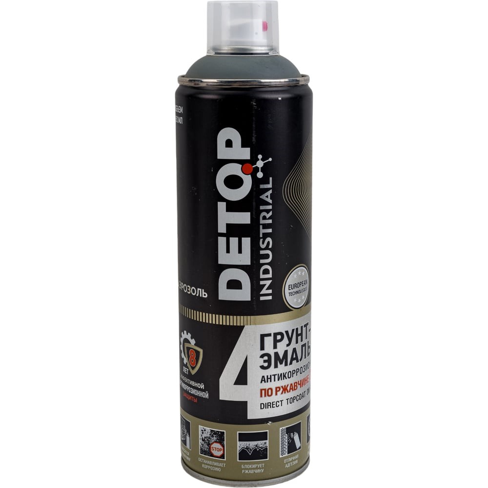 Грунт-эмаль DETOP по ржавчине 3 в 1, серый, RAL 7005, аэрозоль 650 мл DTI-A07718 выполняет функцию преобразователя ржавчины, антикоррозионного грунта и декоративной эмали. Применяется для покраски чугунных и стальных поверхностей с различной степенью коррозии: от следов коррозии до полностью покрытых ржавчиной, плотно сцепленной с металлом, толщиной до 70 мкм. Предназначена для защиты металлических конструкций промышленного назначения, очистка которых затруднена. Используется для окраски поверхностей, подвергающихся атмосферному воздействию, в том числе промышленной атмосферы, содержащей агрессивные газы и пары, соли и другие химические реагенты, имеющие температуру не выше 60 градусов. Внимание! Фото может отличаться от товара, при выборе ориентируйтесь на технические характеристики.
