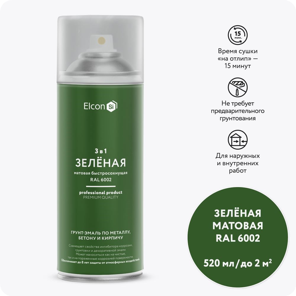 Грунт-эмаль по ржавчине 3 в 1 Elcon матовая, зеленая, 520 мл, аэрозоль 00-00462567 предназначена для нанесения как на чистые, так и на пораженные коррозией металлические поверхности с целью создания надежной антикоррозионной защиты металлоконструкций, оборудования, металлических изделий. Компоненты, входящие в состав, преобразуют ржавчину в прочный защитный слой, препятствуют дальнейшей коррозии и образуют на поверхности металла прочное атмосферостойкое покрытие. Продукт может наноситься при отрицательных температурах до -20 градусов, время сушки "на отлип" при температуре +20 градусов составляет не более 1 часа.