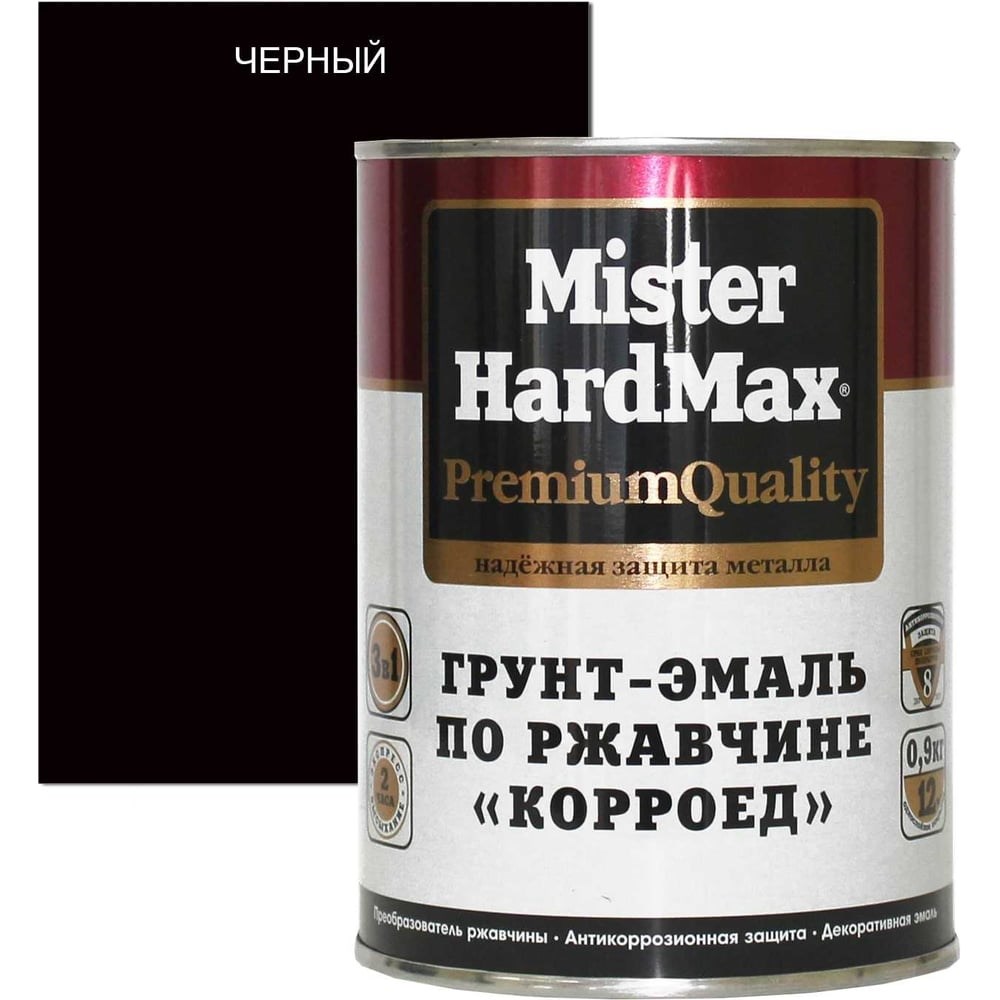 Грунт-эмаль по ржавчине HardMax Корроед черная, банка 0.9 кг, 1 шт. 4690417070947 служит для одновременного преобразования ржавчины, антикоррозионного грунтования, финишной окраски чистых и прокорродировавших металлических поверхностей (с толщиной прочно связанной с металлом ржавчины до 100 мкм). Используют для обработки строительных конструкций, промышленного оборудования, складских помещений, ангаров, гаражей, труб, ворот, дверей, навесов, кованной мебели, декоративных ограждений, решеток. Состав образует прочную, ровную, полуматовую поверхность с высокой атмосферо- и противокоррозионной стойкостью. Покрытие устойчиво к действию технических масел, нефти, дизельного топлива, этилового спирта. Выдерживает кратковременное воздействия пресной и морской воды, слабых кислот и бензина. Применение продукта упрощает подготовку поверхности перед окрашиванием и удешевляет технологию создания антикоррозионного покрытия, т.к. не требует предварительного удаления прочно связанной ржавчины и грунтования. Система покрытия, состоящая из трех слоев грунт-эмали, в условиях умеренно-холодного климата сохраняет защитные свойства в течение 8 лет.