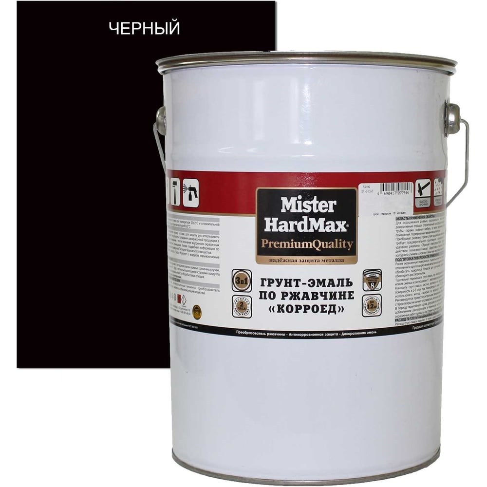 Грунт-эмаль по ржавчине HardMax КОРРОЕД MISTER (черная; 21 кг) 4690417070961 предназначена для одновременного преобразования ржавчины, антикоррозионного грунтования и финишной окраски чистых и металлических поверхностей с толщиной прочно связанной с металлом ржавчины до 100мкм. Грунт-эмаль можно использовать в качестве антикоррозионной грунтовки под финишные атмосферостойкие эмали в многослойных системах покрытий. Грунт-эмаль представляет собой суспензию антикоррозионных пигментов и наполнителей в растворе модифицированного алкидного лака с добавлением органических растворителей и целевых добавок. Объекты Строительные конструкции, промышленное оборудование, складские помещения, ангары, гаражи, трубы, ворота, двери, навесы, кованая мебель, декоративные ограждения, решетки и другие изделия. Внимание! Расход материала может изменяться в зависимости от типа и степени подготовленности поверхности, выбранного инструмента, условий нанесения.