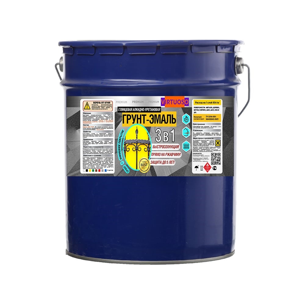 Грунт-эмаль Virtuoso premium 3 в 1 по ржавчине серая 20 кг 11596308 представляет собой суспензию противокоррозионных пигментов, преобразователя ржавчины и наполнителей в алкидном лаке с добавлением сиккатива, растворителя и технологических добавок. Состав: лак алкидный, двуокись титана, пигменты, преобразователь ржавчины, наполнители, технологические добавки. Свойства: эмаль готова к применению. Образует глянцевое покрытие, устойчивое к действию ржавчины, воды, моющих средств, трансформаторного масла. Назначение: эмаль предназначена для защиты и окраски частично прокорродированных металлических поверхностей, подвергающихся атмосферным воздействиям и для окраски внутри помещений. Сочетает в себе свойства преобразователя ржавчины и декоративной эмали. Расход: На однослойное покрытие в зависимости от цвета 100- 180 г/м 2. Время высыхания: Однослойного покрытия при температуре 18-22° С и относительной влажности (65±5) % от "пыли "- 10 ч, полное высыхание - не более 24 часа