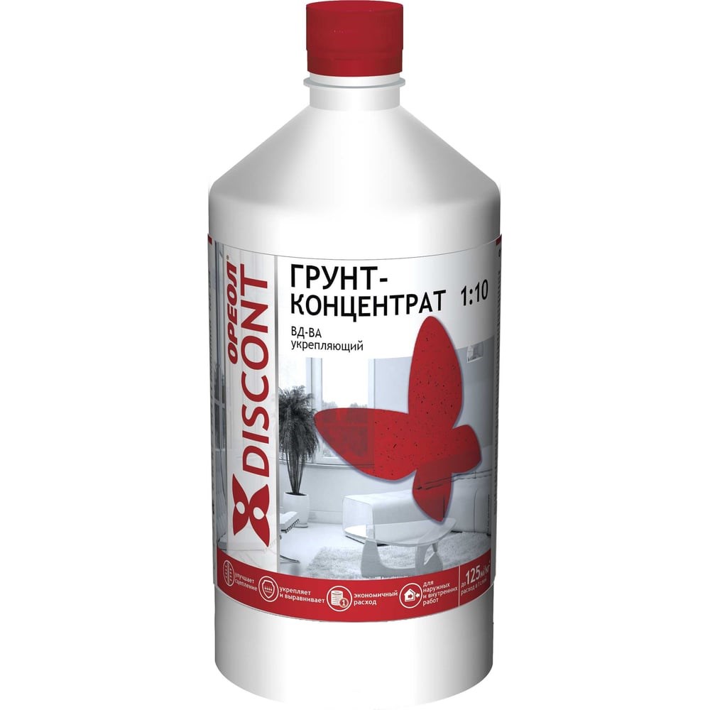 Грунт-концентрат ОРЕОЛ Дисконт ВД-ВА 1 кг 4209 предназначен для пропитки и грунтования различных поверхностей (кроме металлических) внутри и снаружи помещений. Продукт укрепляет обрабатываемую поверхность и выравнивает впитывающую способность минеральных и деревянных оснований перед нанесением шпатлевок, водно-дисперсионных красок, а также перед оклейкой обоями. Готов к применению. Легко наносится. Укрепляет обрабатываемую поверхность, улучшает межслойную адгезию, сокращает расход финишного ЛКМ. Не имеет резкого запаха. После высыхания образует эластичное прозрачное покрытие. Расход: 0.08 - 0.2 кг/кв. м.