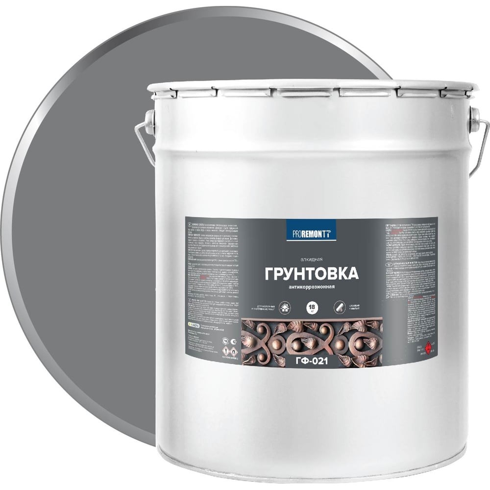 Грунт PROREMONTT ГФ-021 серый, 18 кг Лк-00004522 предназначен для обработки поверхностей из металла и дерева внутри и вне помещений. Используется перед нанесением лакокрасочных покрытий. Грунт легко наносится и обладает антикоррозийными свойствами. Перед использованием средства следует очистить поверхность от загрязнений.