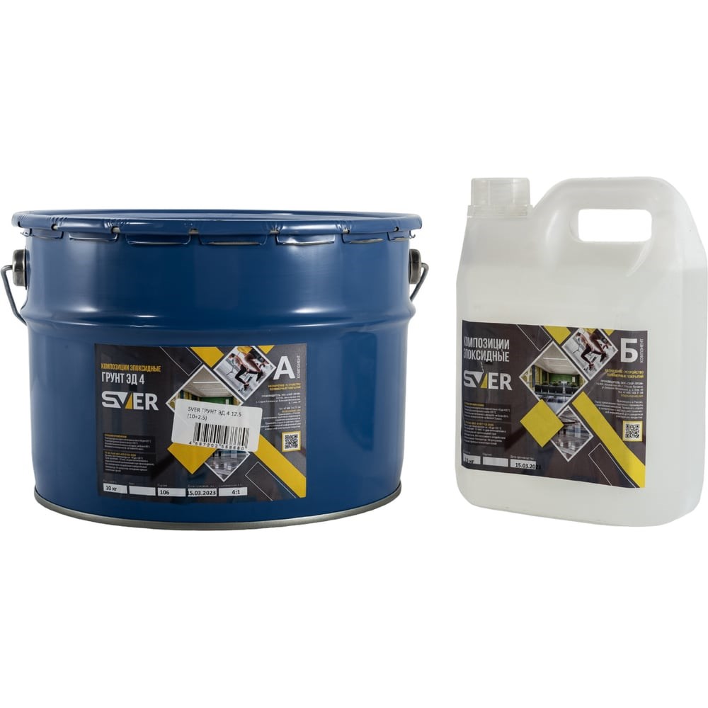 Грунт SVER ЭД 4 12.5 кг (10+2.5 кг) 1000145 - это двухкомпонентный эпоксидный порозаполняющий грунт. Не содержит растворителей. Область применения: Грунтование поверхности при устройстве полимерных покрытий (эпоксидных и полиуретановых). Шпатлевание поверхности (в смеси с песком). Устройство плинтусов, откосов и т.п. (в смеси с песком и специальной добавкой). Для поверхностей: Бетон, пескобетон, цементные наливные полы, плитка, камень, кирпич и другие минеральные поверхности. Металлические поверхности. Приготовление состава. Грунт ЭД 4 имеет два компонента ("А" и "Б"), которые находятся в тщательно подобранном соотношении. При необходимости частичного использования упаковки следует четко соблюдать соотношение компонентов. При несоблюдении этого правила, возможно появление аминной пленки на поверхности, остаточная липкость или потеря физикомеханических свойств слоя. Перемешивание состава производится мешалкой (400-600 оборотов в минуту) со спиральной насадкой, обеспечивающей движение смеси снизу вверх. Диаметр насадки должен быть не менее 1/3 диаметра емкости. При перемешивании компонентов насадка миксера не должна подниматься над уровнем материала, чтобы не вовлекать излишний воздух в состав. Пропорции смешения весовое соотношение: 4 части компонента А к 1 части компонента Б.
