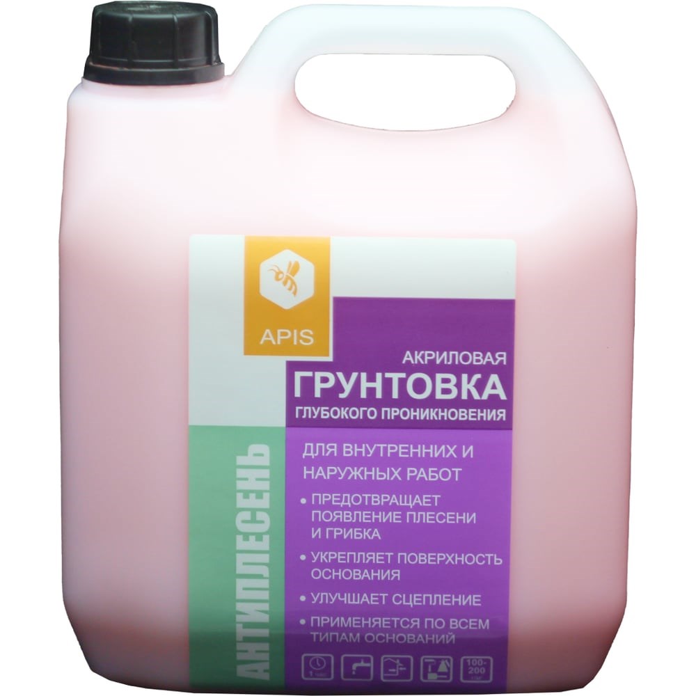 Грунтовка глубокого проникновения APIS Антиплесень, розовый, канистра 3 кг 4665296514318 используется снаружи и внутри влажных помещений перед финишной отделкой стен, полов и потолков. Состав улучшает адгезию материалов (краска, клей), обеспыливает и укрепляет рыхлые основания. Продукт после высыхания обеспечивает надежную защиту от возникновения грибка и плесени.