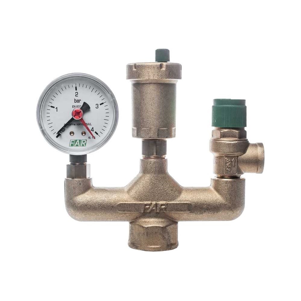 Группа безопасности котла FAR ВР FA 2115 1 применяется для защиты от превышения давления в автономной системе водяного отопления и горячего водоснабжения с максимальным давлением 10 бар. Состоит из латунного корпуса, предохранительного клапана, автоматического воздухоотводчика и манометра. Оснащен датчиком температуры. Воздухоотводчик предназначен для отвода воздуха и газов. Манометр служит для индикации давления. Максимальное давление - 10 бар. Давление срабатывания - 3 бар. Максимальная температура рабочей среды - 95°C. Присоединение - внутренняя резьба 1".