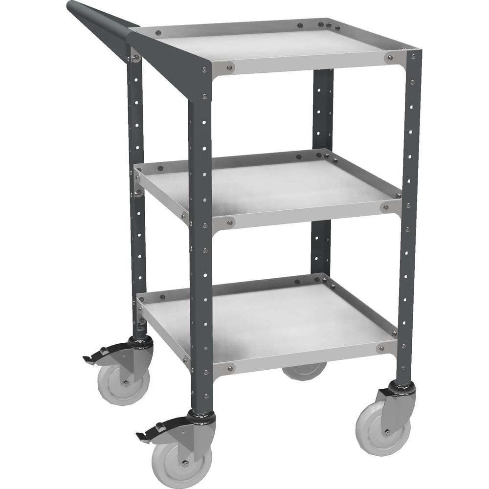 Грузовая тележка предназначена для хранения и транспортировки инструмента, а также рациональной организации рабочего места в мастерской, гараже, доме. Тележка укомплектована 3 полками с отбортовкой, которые регулируются по высоте с шагом 50 мм. Максимальная нагрузка на тележку – 500 кг. Максимальная нагрузка на полку – 100 кг. Поворотные колеса, два колеса с тормозом, не оставляют чёрных следов.
