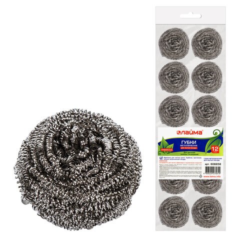 Губки (мочалки) металлические, спиральные, 12х15 г, КОМПЛЕКТ 12 шт., для посуды, гриля, плиты, LAIMA, 606658