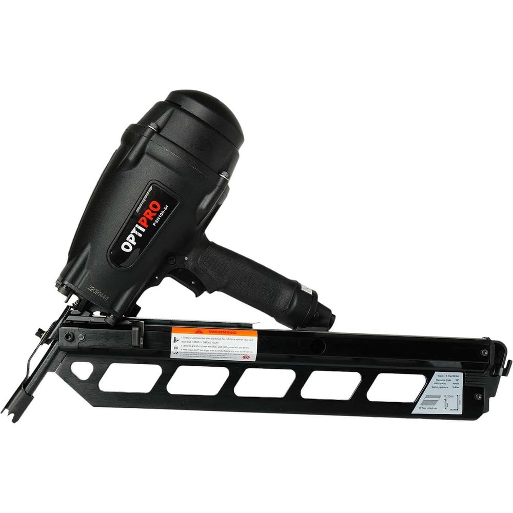 Пневмоинструмент гвоздезабивной Optipro PSN100-34 применяется для работ по дереву при сборке каркасов, обрешетки и креплении грузов, производстве кабельных барабанов: Инструмент предназначен для работы реечными гвоздями в бумажной обойме с D-образной шляпкой (тип D34) с углом наклона 34° , длиной от 50 до 100 мм; Инструмент может работать как в режиме пистолета, так и в режиме молотка; Имеет регулировку глубины забивания гвоздя; Надежен и прост в эксплуатации, работа с ним не требует специальных знаний и навыков; Обладает большим ресурсом и высокой производительностью.