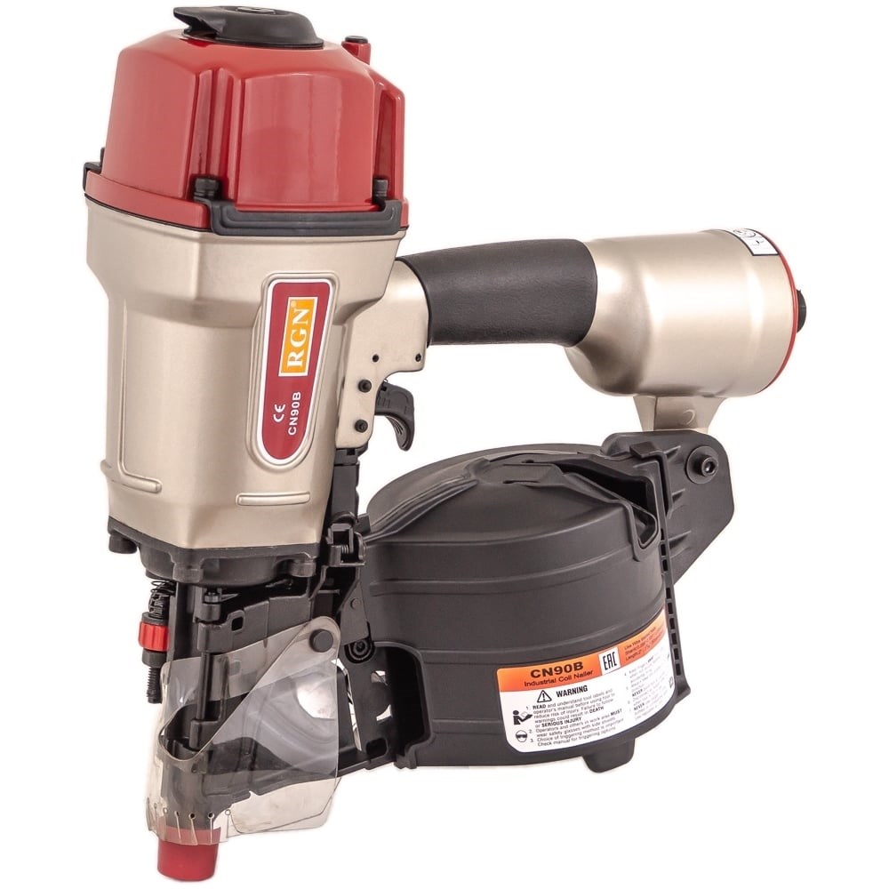 Гвоздезабивной пневмоинструмент RGN CN90B каркасного типа. Предназначен для выполнения работ, связанных с каркасным домостроением, а так же общих работ по дереву. Модель работает от сжатого воздуха, в диапазоне давления 5-8 бар. Рекомендован для тяжелых условий эксплуатации, на открытом воздухе с переменной влажностью и температурой до минусовых значений. Применяемый крепёж - барабанные гвозди от 50 до 90 мм в обойме.
