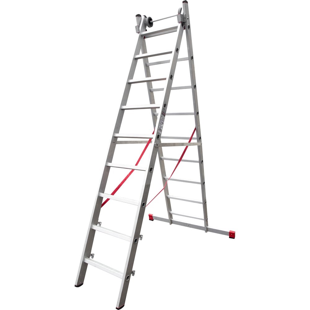 Алюминиевая двухсекционная индустриальная лестница Новая Высота 2х9 5220209 может использоваться в качестве приставной лестницы, приставной выдвижной лестницы и стремянки. Имеет надежную и прочную алюминиевую конструкцию, которая способна выдержать нагрузку до 150 кг. Верхняя секция оборудована колёсами для удобства раздвижения по стене. Все зацепы имеют автоматический фиксатор, что облегчает эксплуатацию лестницы. На траверсе и стойках расположены опорные наконечники из пластика, которые препятствуют скольжению. Ступени с рифлёной поверхностью обеспечивают безопасный подъем и спуск. Внимание! Количество ступеней отличается от представленного на фото.