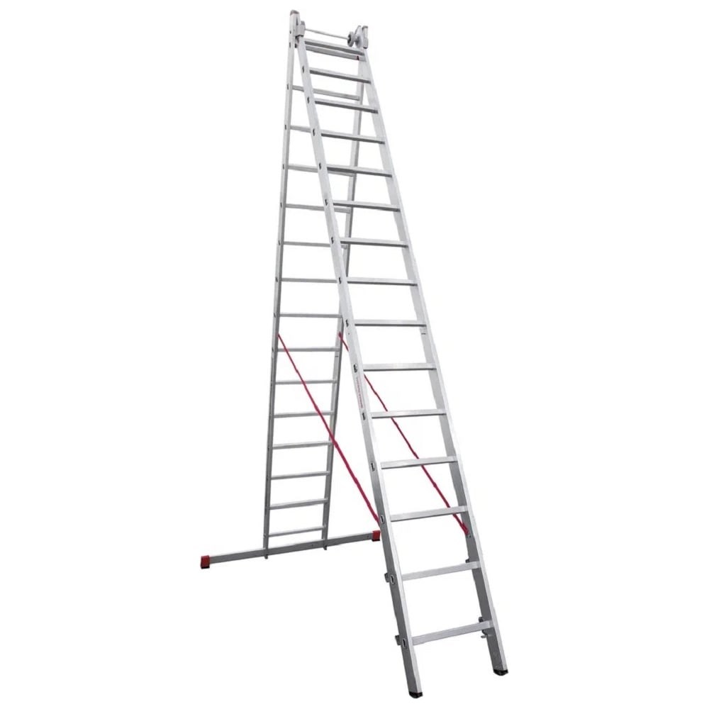 Алюминиевая двухсекционная индустриальная лестница Новая Высота 2х18 5220218 может использоваться в качестве приставной лестницы, приставной выдвижной лестницы и стремянки. Имеет надежную и прочную алюминиевую конструкцию, которая способна выдержать нагрузку до 150 кг. Верхняя секция оборудована колёсами для удобства раздвижения по стене. Все зацепы имеют автоматический фиксатор, что облегчает эксплуатацию лестницы. На траверсе и стойках расположены опорные наконечники из пластика, которые препятствуют скольжению. Ступени с рифлёной поверхностью обеспечивают безопасный подъем и спуск. Внимание! Количество ступеней отличается от представленного на фото.