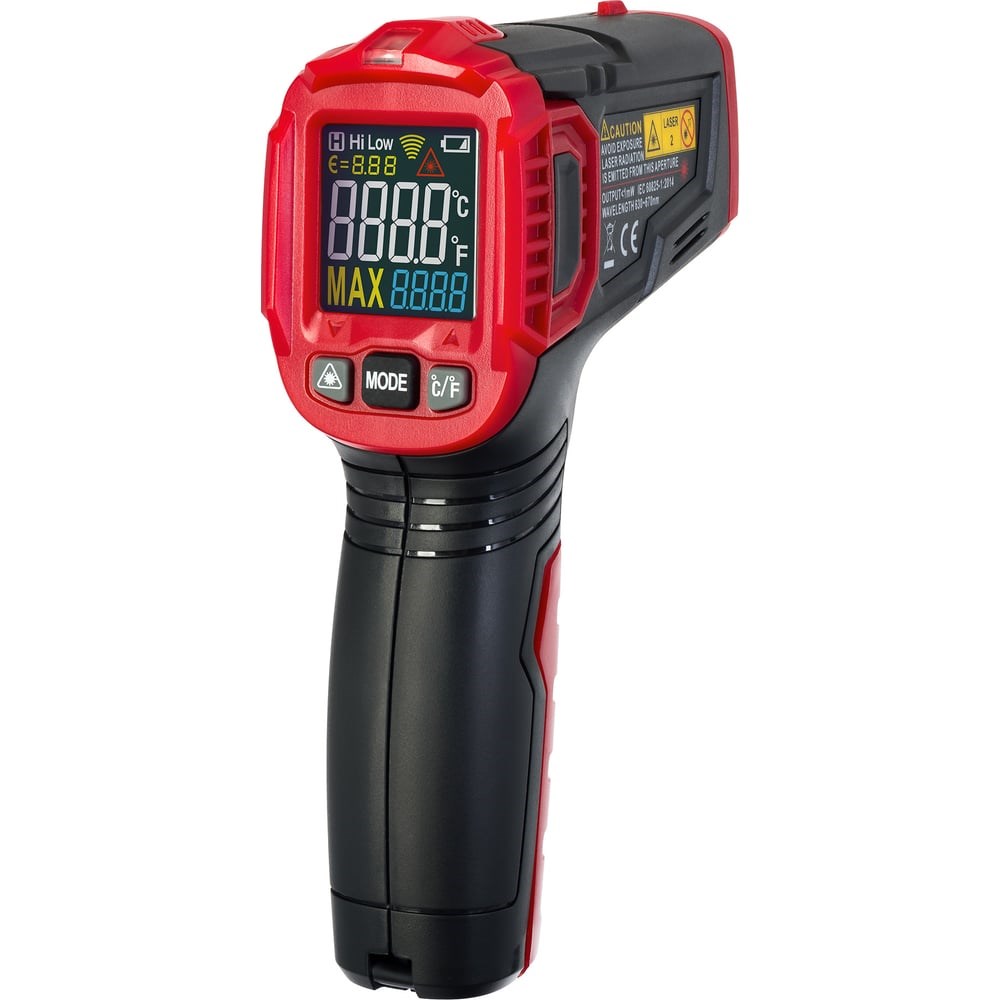 Бесконтактный термометр Ermenrich Seek FR40 определяет температуру тела, объекта или окружающей среды по инфракрасному излучению. Это позволяет производить измерения температур в сложных условиях, где невозможен физический контакт с предметом наблюдения.Пирометр определяет температуру в диапазоне –50…+550 градусов по Цельсию, также возможно настроить отображение результатов в градусах по Фаренгейту. Скорость замера составляет не более 0,5 секунды. При зажатом «курке» производится непрерывное измерение, зафиксировать полученный результат можно отпустив кнопку. Термометр позволяет устанавливать собственные минимальные и максимальные значения – при их достижении прибор подает световой сигнал.Для удобства пользователя термометр оснащен лазерным указателем, который помогает точно навести прибор на объект. Данные отображаются на цветном экране. Здесь же имеется индикатор уровня заряда батареи. Работает прибор от комплекта из 2 батареек типа ААА (не входят в комплектацию). Для экономии заряда прибор автоматически отключается через 30 секунд.