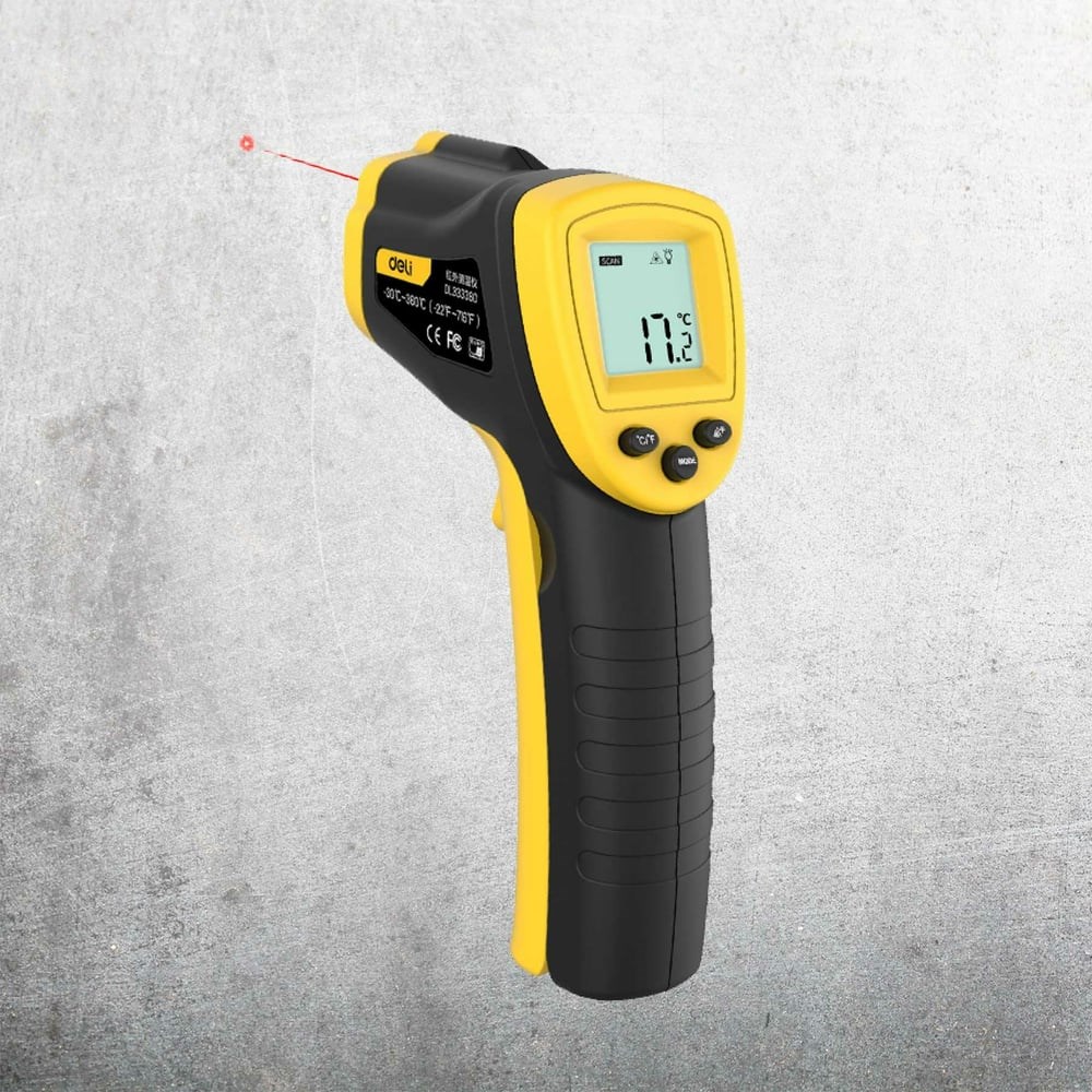 Инфракрасный пирометр (термометр) Deli DL333380 предназначен для бесконтактного определения температуры любой поверхности. Термометр имеет небольшой вес и компактные размеры, но при этом присутствуют все необходимые функции. Прибор используется как в промышленных целях - для измерения температуры в строительстве и ЖКХ, автосервисах и пр, так и в бытовых целях - поможет измерить температуру воды или установить места, в которых окна пропускают холод. Позволяет измерять температуру как в градусах Цельсия, так и в Фаренгейтах в широком диапазоне от -30 до 380℃ и от -22 до 716℉Практически мгновенное измерение - всего 0,5 сек, а Оптическое разрешение 8:1 позволяет работать на относительно безопасном для пользователя расстоянии. Все полученные результаты отображаются на ЖК-дисплее с яркой светодиодной подсветкой, облегчающей работу в слабоосвещенных местах. Функция DATA HOLD позволяет фиксировать данные на экране, что обеспечивает удобство при замерах в ограниченном пространстве. Работает на двух мизинчиковых батарейках ААА 1,5В (водят в комплект), что позволит легко и быстро заменить элементы питания в случае необходимости, а закреплённая крышка батарейного отсека не потеряется.