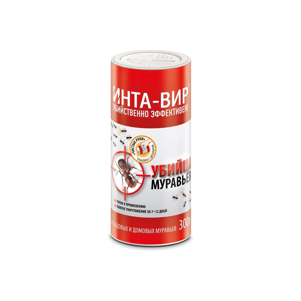 Инсектицид Инта Вир в банке 300г Сз0102ИНТ04 предназначен для защиты от домашних и садовых муравьев. Полностью уничтожает вредителей за 7-12 дней. Безопасен для растений и почвы.