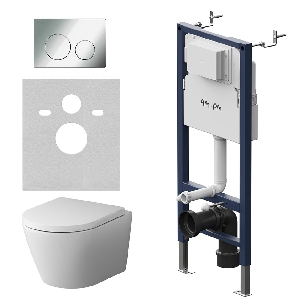 Инсталляция AM.PM с клавишей PrimeFit L глянцевый хром, с подвесным унитазом Sense FlashClean, с сиденьем с микролифто