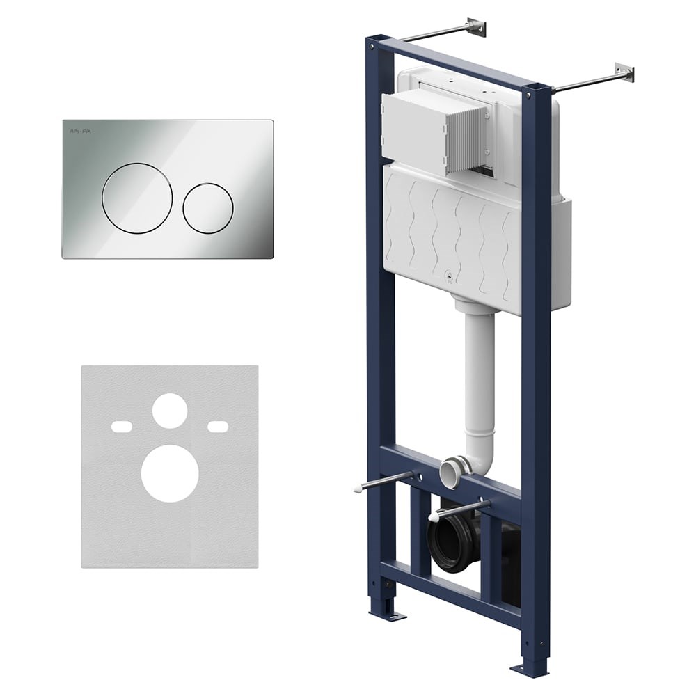 Максимально полная комплектация - все необходимые крепления, патрубки, звукоизолирующая прокладка в комплекте.Вертикальные ребра жесткости в конструкции рамы – дополнительная опора в месте давления керамики на стену.Благодаря им инсталляция более универсальная и подходит для унитазов любых размеров, включая унитазы с небольшой контактной поверхностью. Нет необходимости докупать дополнительные аксессуары для монтажа таких унитазов. Благодаря цельному стальному профилю 40*40 мм толщиной 2 мм инсталляция выдерживает нагрузку до 400 кг.Цельный бесшовный бачок из полиэтилена с защитой от конденсации.Комфортное использование благодаря заливному клапану с низким уровнем шума - менее 20 Дб. В комплекте пневматическая двухрежимная клавиша из ABS пластика в цвете хром глянцевый.