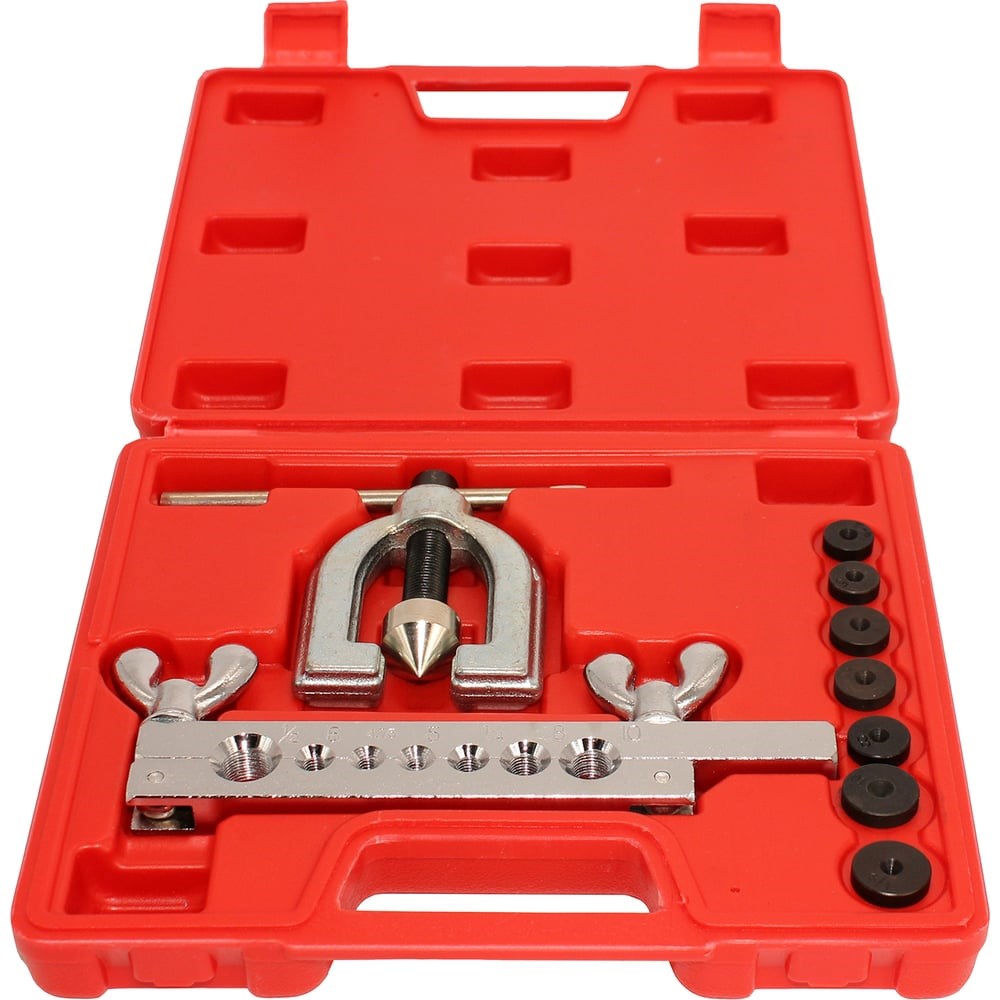 Инструмент для развальцовки труб AE&T 10 предметов TA-M1071 gредназначен для изгибания медных и латунных трубок (до 45 градусов), для развальцовки окончаний медных и латунных трубок. Может применяться для газовых, водопроводных, охлаждающих труб или тормозных систем.