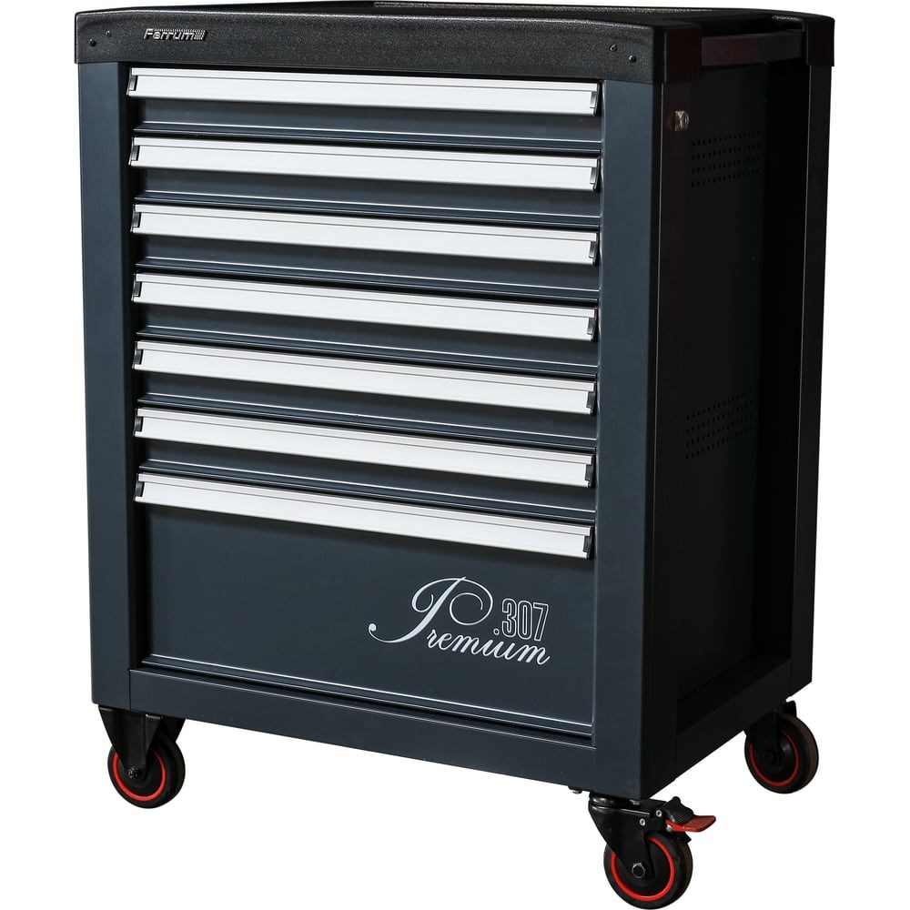 Инструментальная тележка Ferrum "Premium" с 7 ящиками 12.307-7016/7016 для хранения ручного инструмента и оборудования. Тележка оборудована механизмом антиопрокидывания, совмещенным с центральной системой запирания, блокирующем открытие любого выдвижного ящика при уже открытом одном выдвижном ящике, с целью предотвращения самопроизвольного опрокидывания тележки. Количество ключей - 2 шт. Рабочая поверхность тележки установлена крышка из ударопрочного пластика с боковым держателем инструмента и бортиками, исключающим падение инструмента. Боковые поверхности тележек имеют по 2 поля перфорации с каждой стороны. Равнораспределенная нагрузка на корпус тележки -270 кг. Эргономичные ручки ящиков из анодированного профиля с возможностью установки информационной вставки и защитной пленки. Торцы ручек закрыты пластиковыми заглушками. Выдвижение ящиков -92%. Внутренние размеры ящиков: 568х416х66 мм - 6 шт. 568х416х227 мм - 1 шт. Равнораспределенная нагрузка на ящик - 50 кг. Колеса покрыты термопластичной резиной. Стопор с двумя педалями. Фиксация осуществляется в двух направлениях (качения и вращения). Диаметр колес 100 мм.