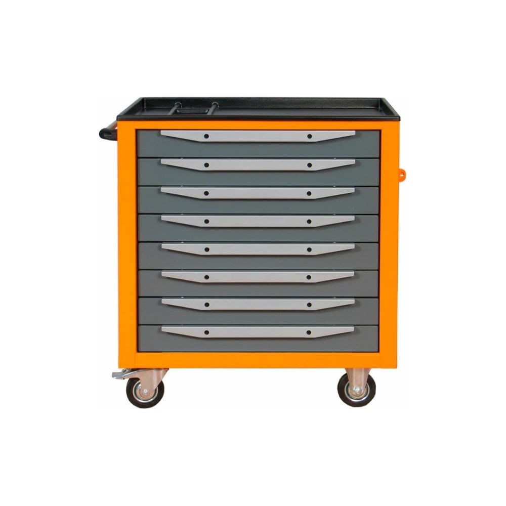 Инструментальная тележка Toollbox серии standart TBS-8 RAL 2008 изготавливается в исполнениях, укомплектованных восемью малыми выдвижными ящиками одного типоразмера по высоте. Корпус тележки инструментальной TBS-8 в исполнениях с выдвижными ящиками изготовлен неразборным, сварным соединением из 1,0мм стали. Корпус устанавливается на четыре колеса с резиновым ободом. Два колеса неповоротные, два поворотные, одно из которых оснащено тормозом. На одной из боковых сторон корпуса устанавливается ручка для передвижения тележки. Верх корпуса закрывается пластиковой крышкой с ячейками для размещения мелких предметов. В вертикальных стойках корпуса исполнений с выдвижными ящиками установлены жесткие упоры, предотвращающие выпадение нагруженных ящиков при наклоне корпуса в сторону выдвижения ящиков, а так же при резком выдвижении ящика в крайнее положение «на себя». Ящики тележки инструментальной TBS-8 фиксируются механизмом центрального замка и могут запираться на навесной замок. Выдвижение ящиков осуществляется с помощью телескопических шариковых направляющих (типа развернутый подшипник) с креплением на зацепах. Вариант крепления направляющих на зацепах позволяет избежать наличия выступающих частей заклепок на внутренних поверхностях выдвижных ящиков, что важно при использовании покупных ложементов для укладки инструмента в ящике. Размеры ящиков рассчитаны под ложементы для инструментов практически всех производителей. Максимальная распределенная нагрузка на ящик 45кг.